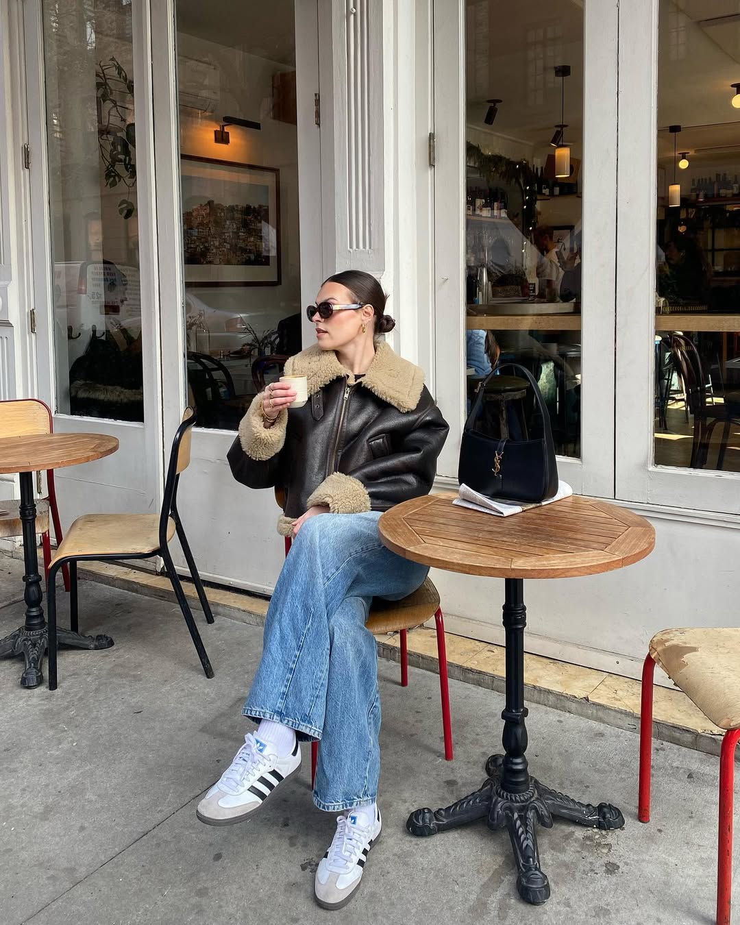 Embracing cold weather fashion becomes simple with a classic aviator jacket. This black leather piece features cozy shearling trim that keeps you warm during chilly café visits. Combining it with relaxed fit jeans creates an effortlessly cool vibe.