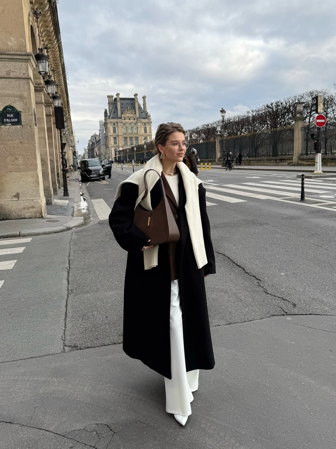 Wandering through city streets becomes more enjoyable with timeless pieces. This floor length black coat paired with white wide leg trousers creates striking contrast. A cream scarf draped casually over your shoulders adds texture to this winter outfit for women.
