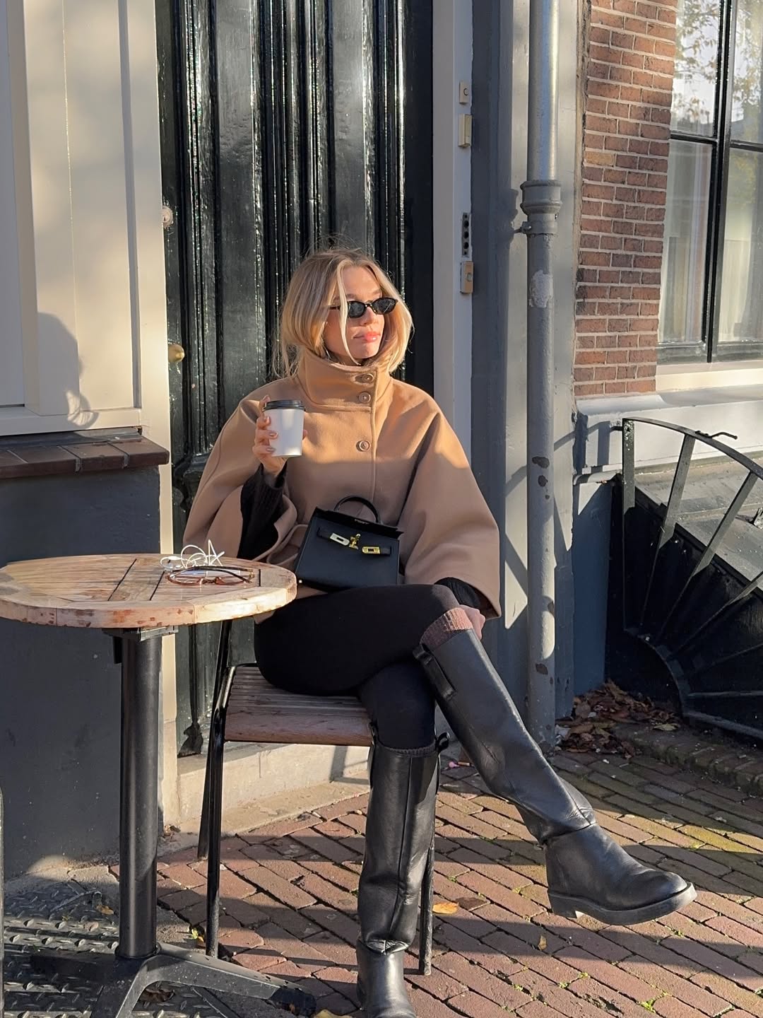 Savoring morning coffee outdoors requires thoughtful winter layering. This camel cape style coat with button details provides warmth without restricting movement. Black leggings create a sleek base for this comfortable yet chic ensemble.