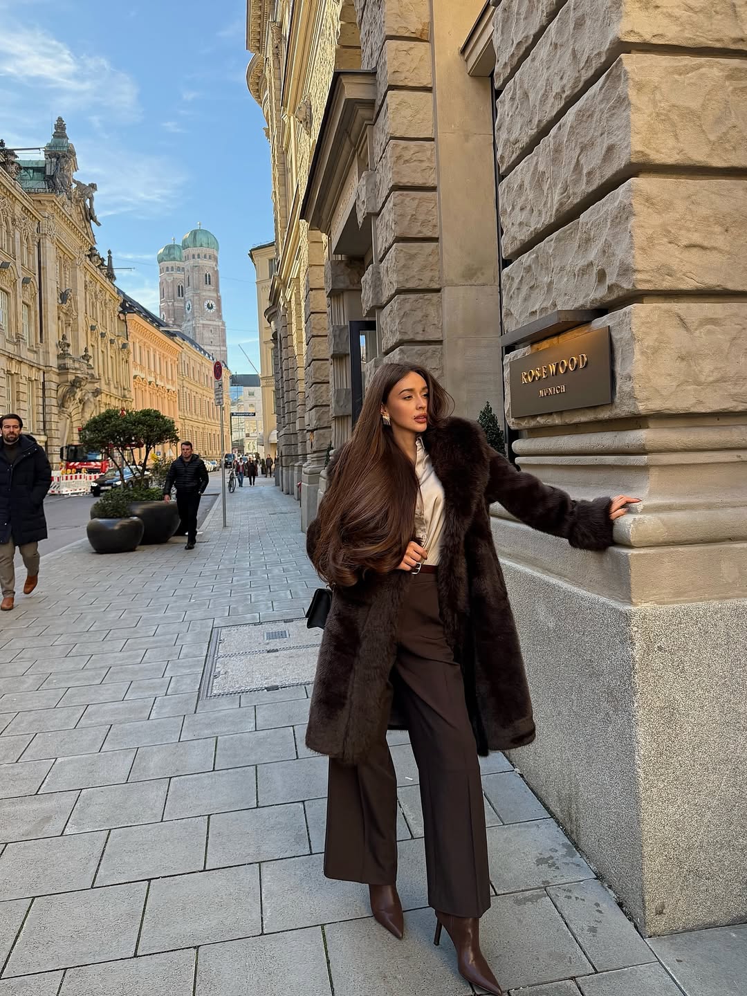 Opulence meets practicality in this luxurious European street style winter ensemble. The plush dark brown faux fur coat provides exceptional warmth while making a bold fashion statement. Paired with chocolate tailored trousers and a cream blouse, this outfit exudes timeless elegance and sophistication.