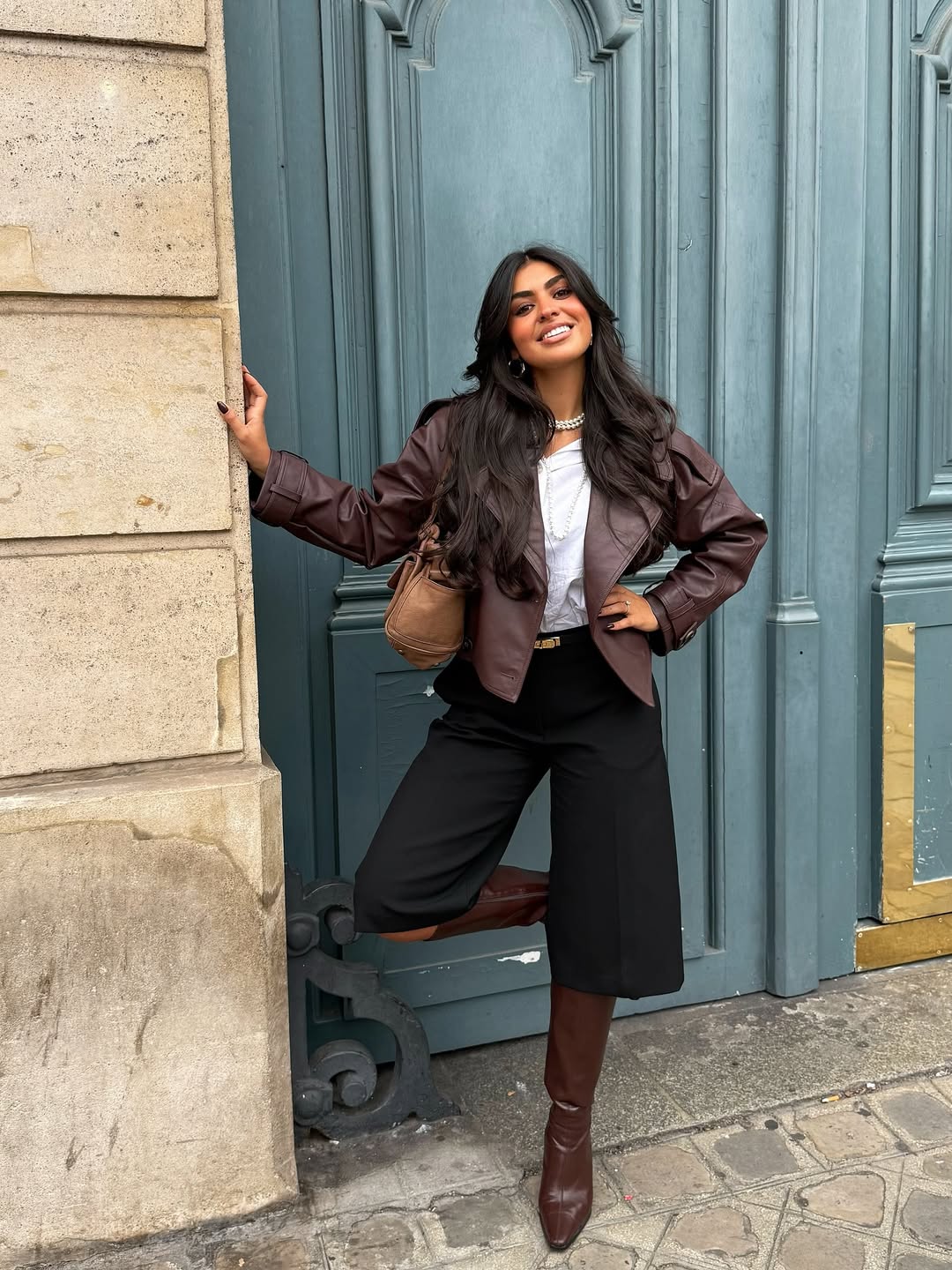 Effortless chic radiates from this polished winter ensemble featuring rich chocolate tones. The oversized brown leather jacket creates an edgy yet sophisticated focal point. Paired with black culottes and a crisp white top, this outfit strikes a balance between relaxed and refined styling.