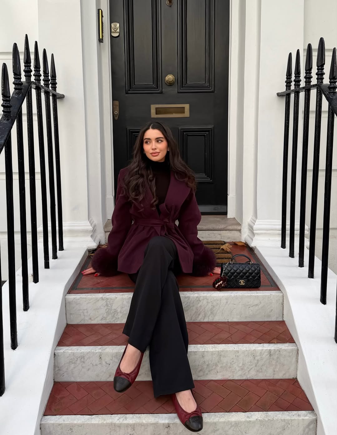 Monochromatic styling allows the deep wine shade to stand out against darker elements. Two-tone loafers add visual interest while maintaining cohesion. The quilted handbag completes this refined aesthetic with timeless appeal.