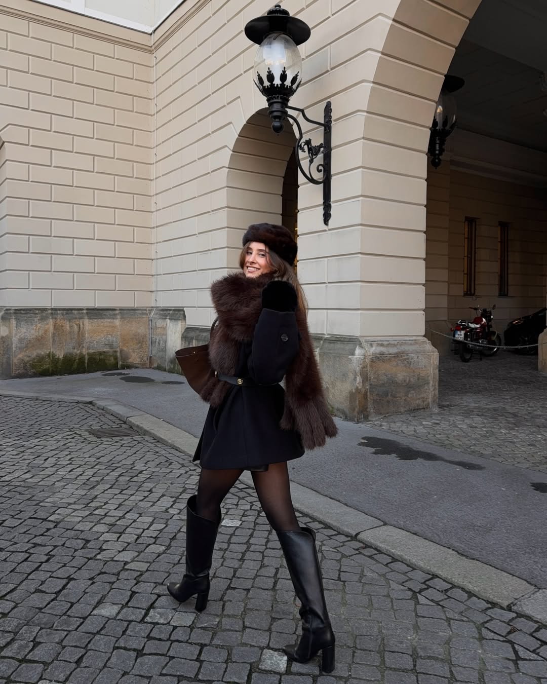 Snowy streets demand sophistication, and this ensemble delivers effortlessly. The rich brown faux fur jacket steals attention while providing warmth against biting winds. Paired with sleek black clothing and a compact crossbody bag, this combination balances glamour with practicality.