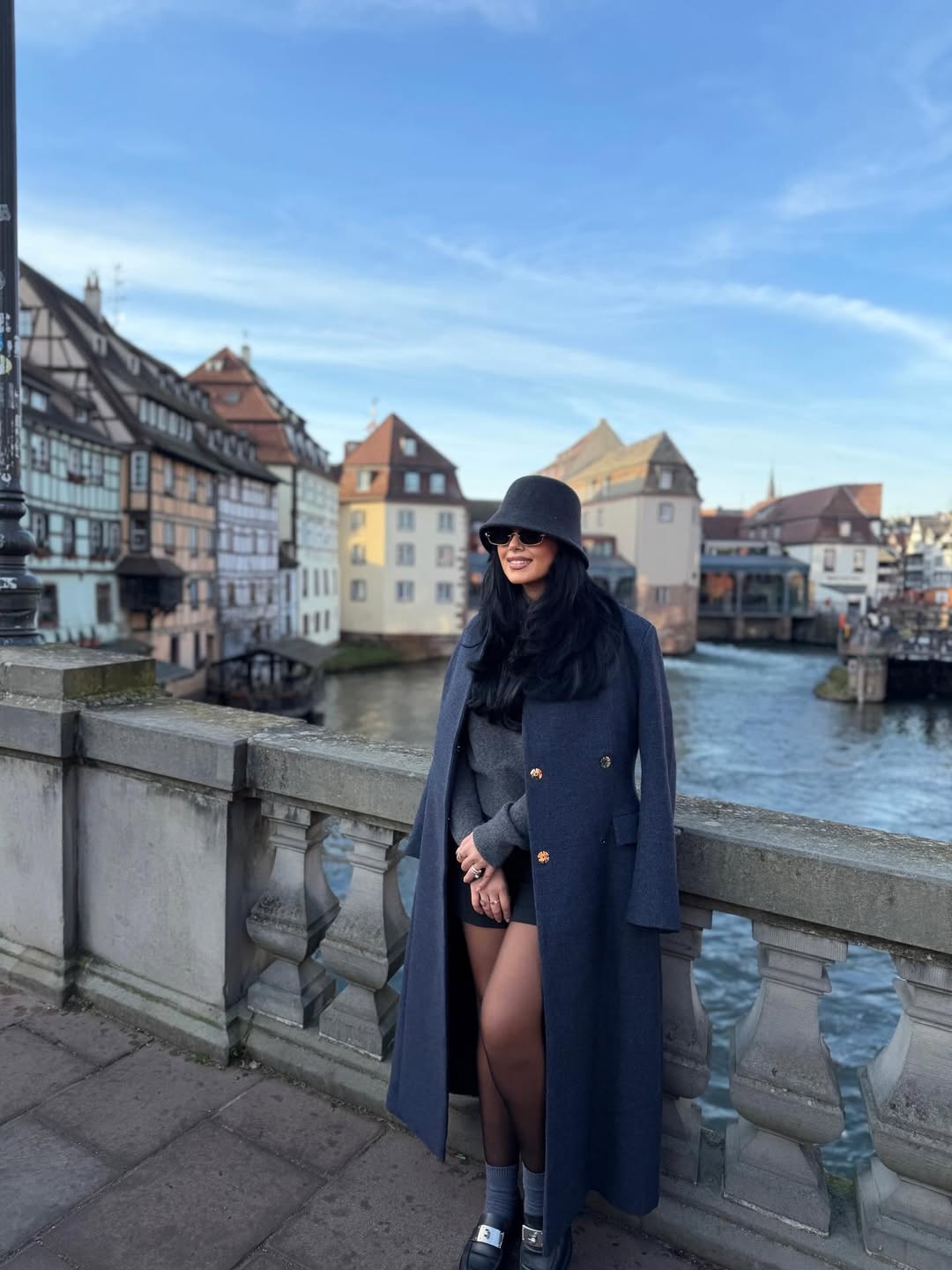 Traveling through Europe during winter requires smart layering choices. This floor-length navy coat provides excellent coverage while looking sophisticated. Gold buttons add a luxurious touch to the classic silhouette.
