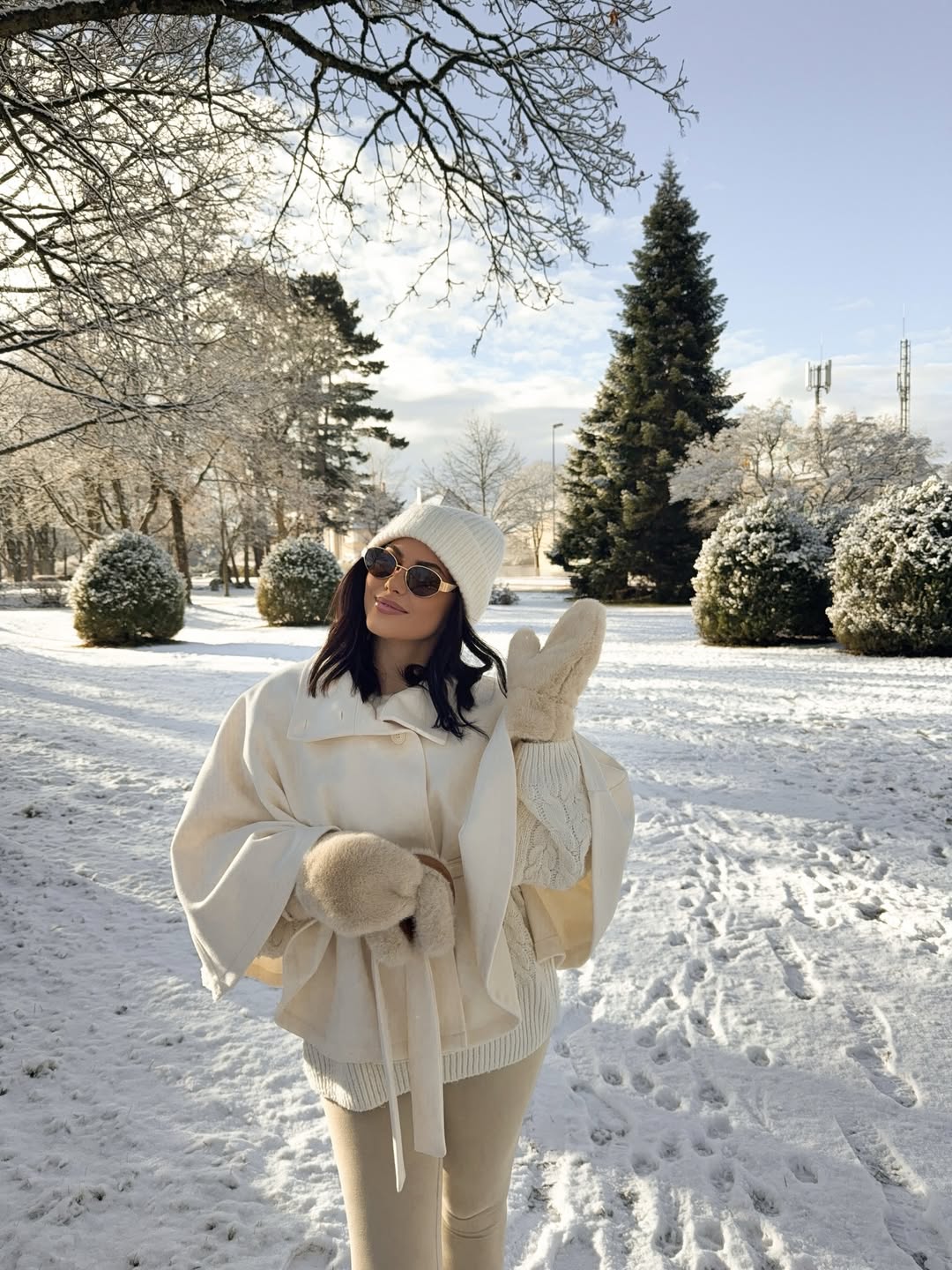 Bundling up doesn’t mean sacrificing fashion sense. An oversized belted jacket paired with matching knitted accessories brings warmth and elegance together. Adding sunglasses completes the chic winter aesthetic while protecting your eyes from harsh glare.