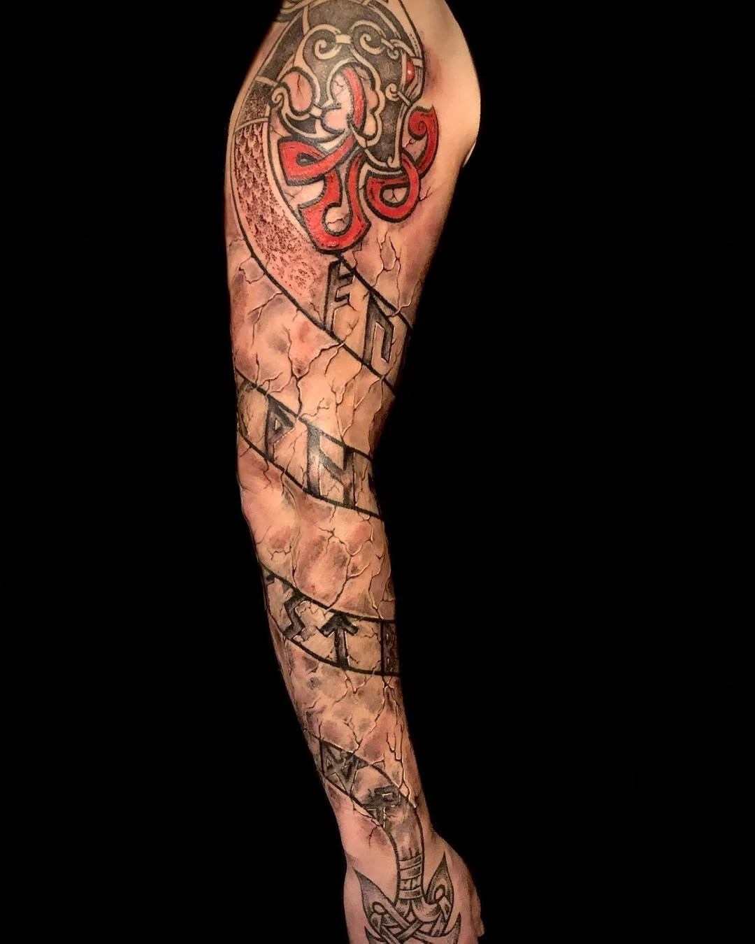 This stunning Celtic-Norse sleeve tattoo features cracked stone textures, ancient runes, and a bold warrior motif, symbolizing endurance, ancestry, and inner strength. The serpentine ribbon of runes winds down the arm, representing fate and wisdom, while the red-accented knotwork adds a striking contrast.
