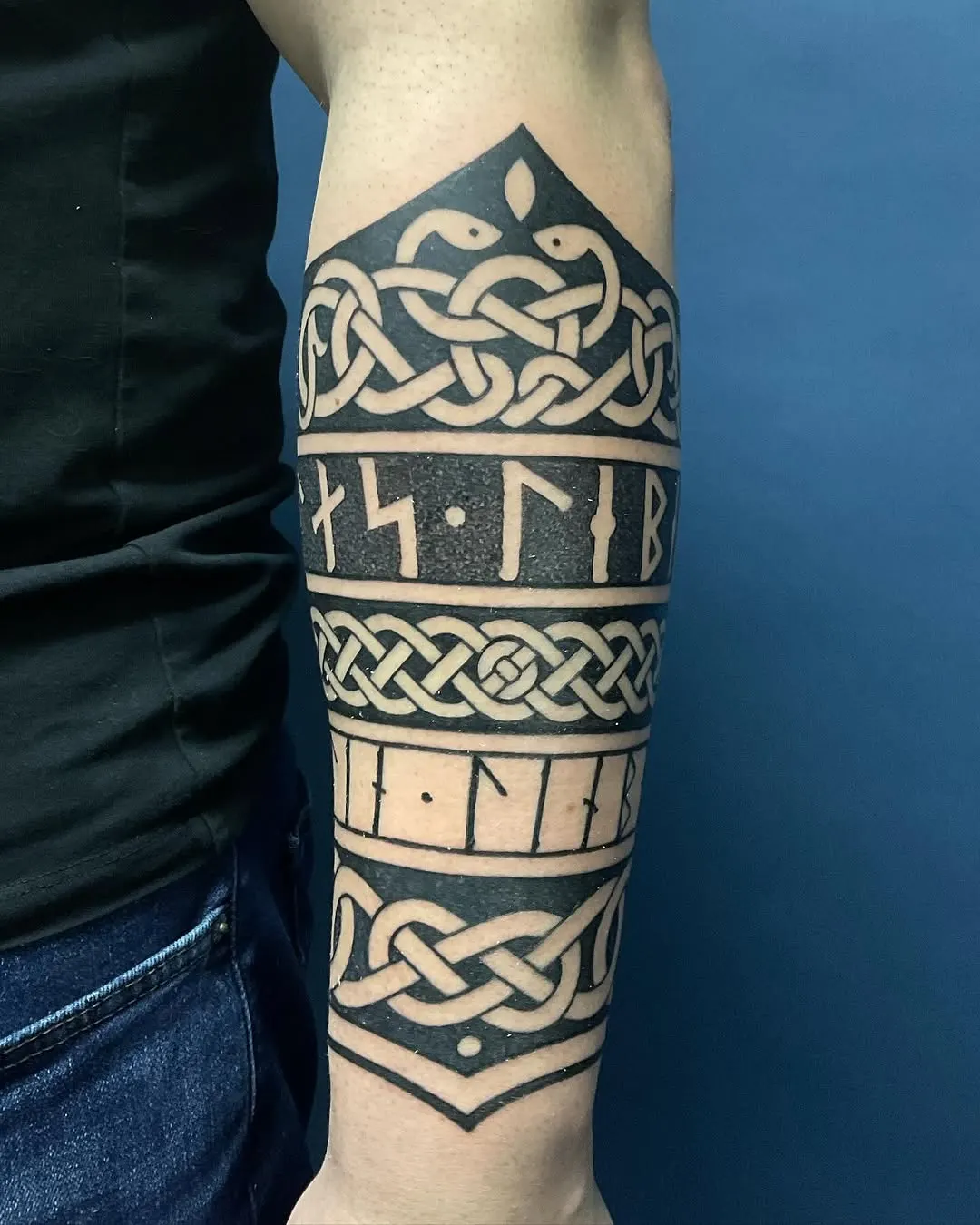 This bold Celtic armband tattoo combines intricate knotwork, runes, and geometric patterns, symbolizing protection, power, and ancestral wisdom. The serpent-like knots at the top hint at transformation and eternity, while the runes add a layer of mysticism and personal meaning.