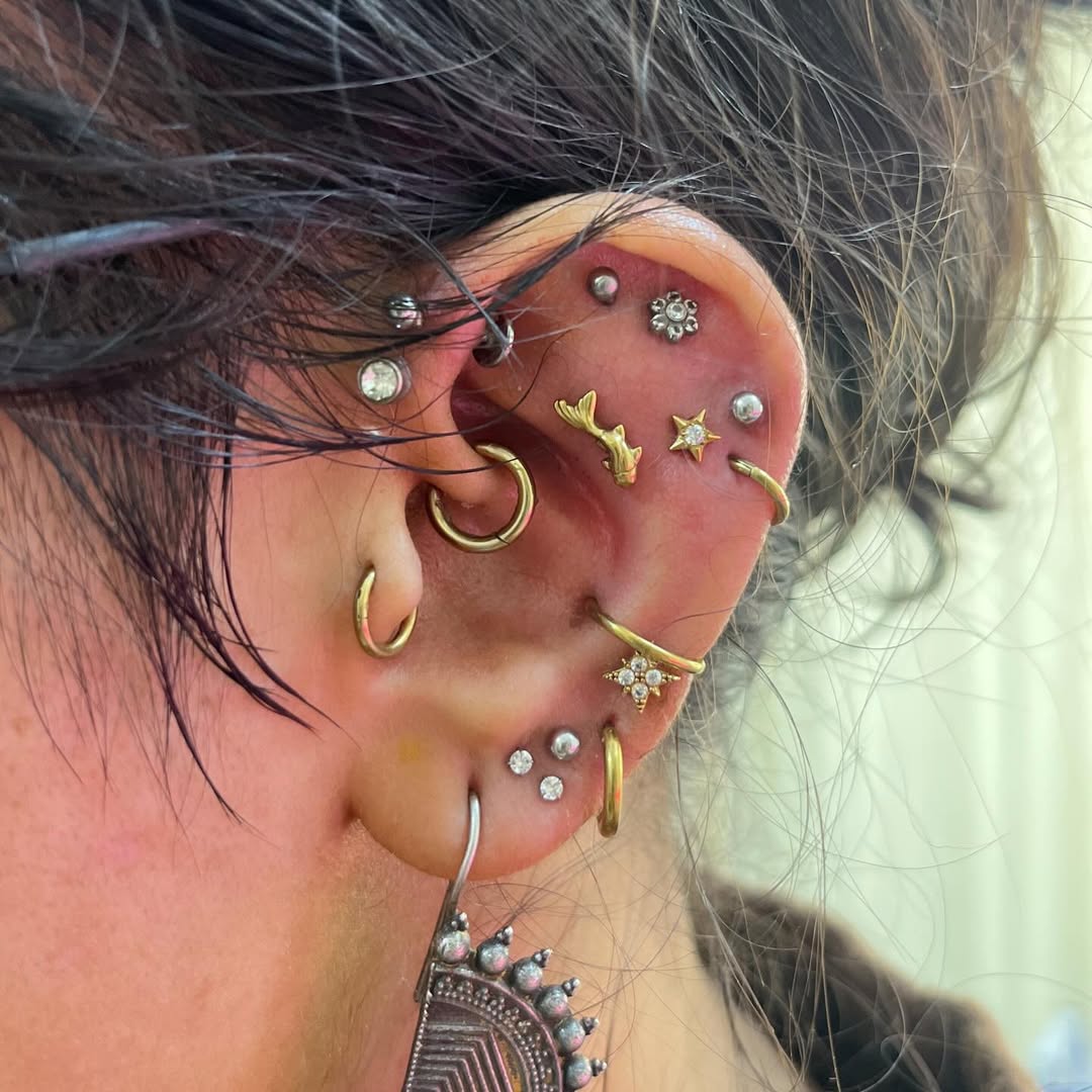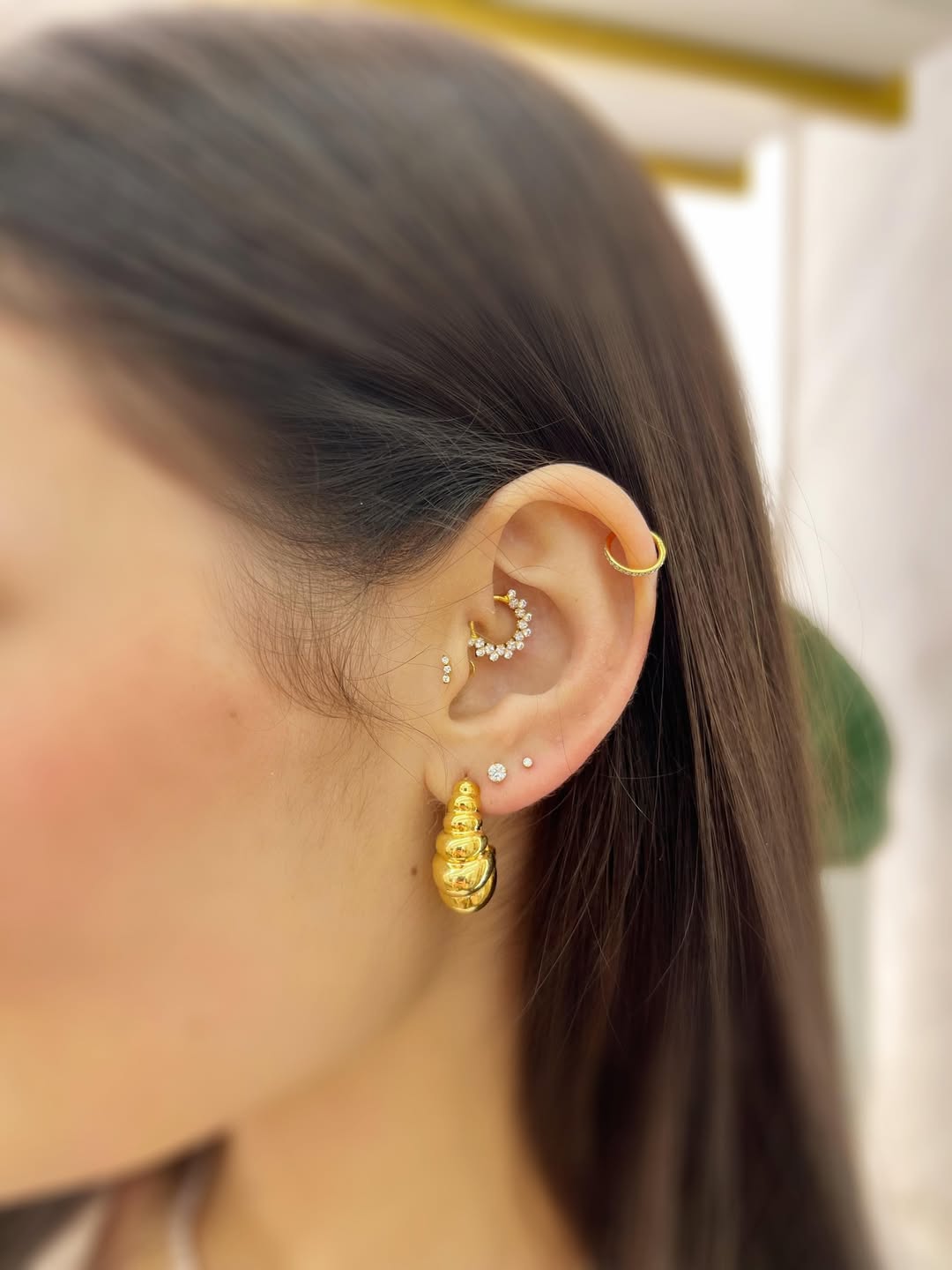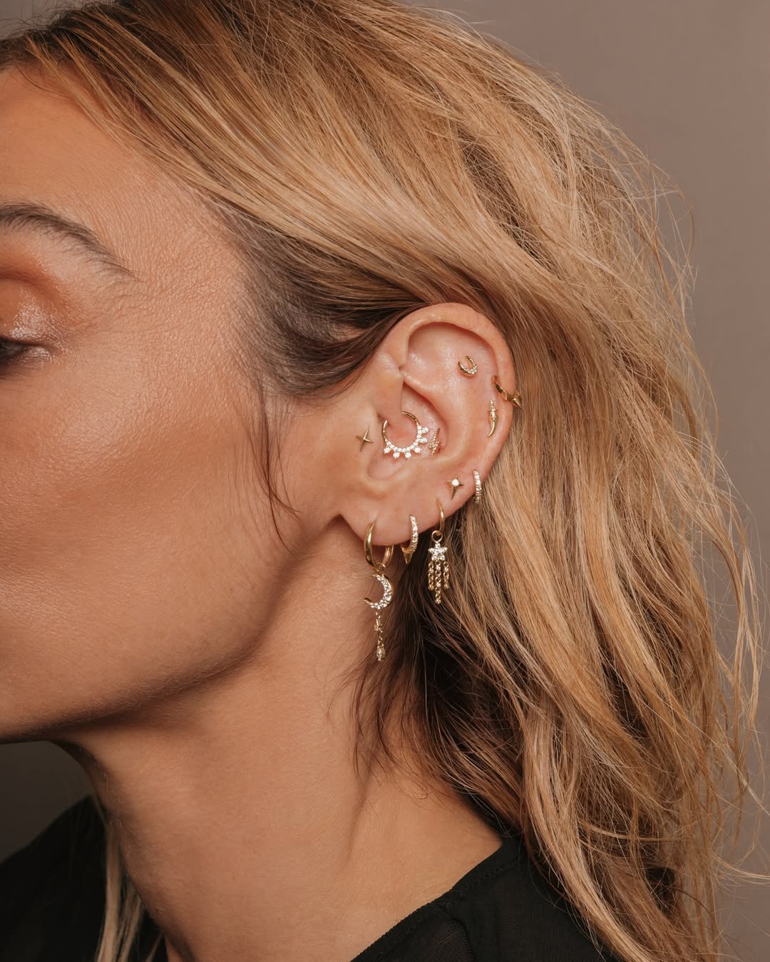 A pearl adorned crescent piece highlights the daith area, becoming the focal point of this extensively curated ear. Multiple tiny hoops and studs populate the cartilage, creating layered dimension.