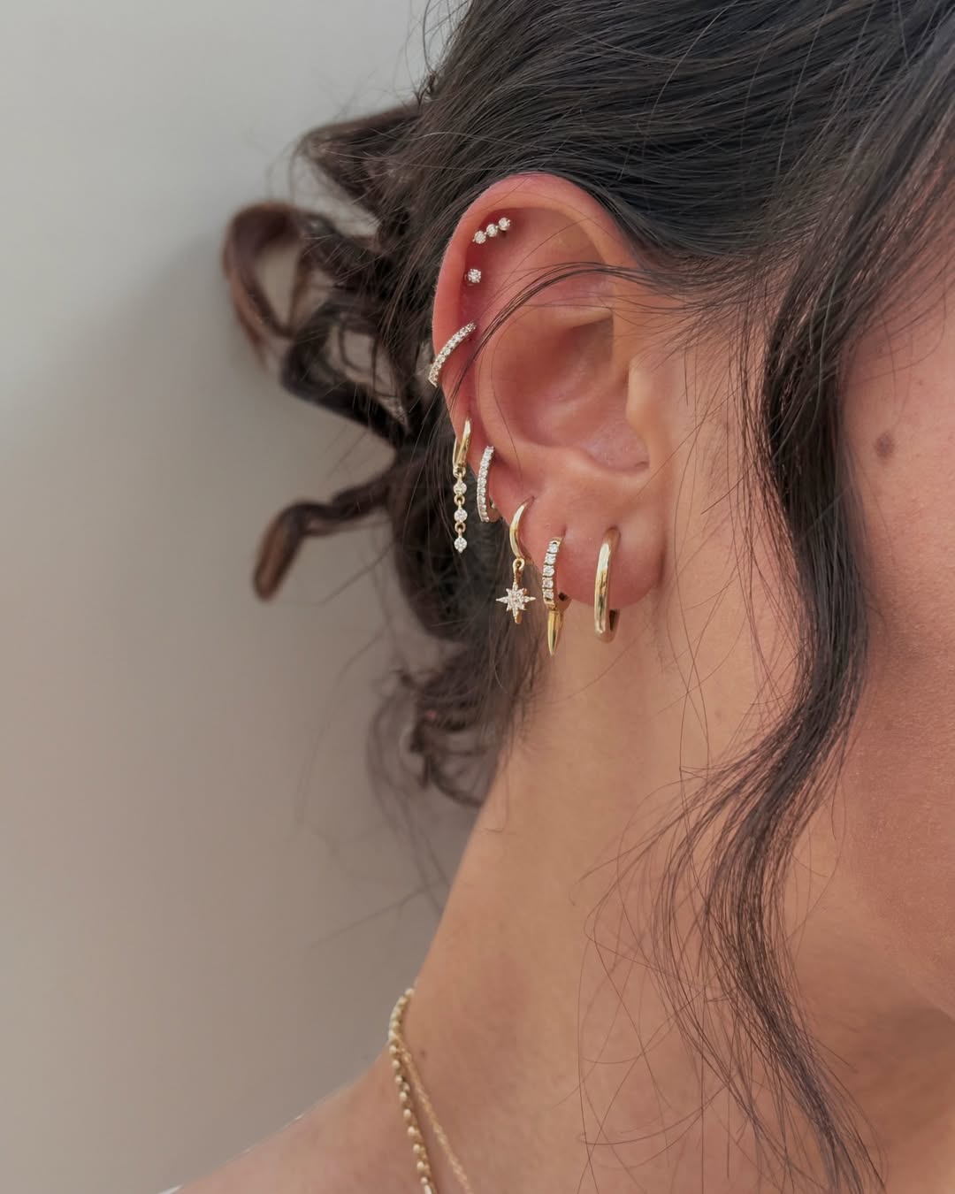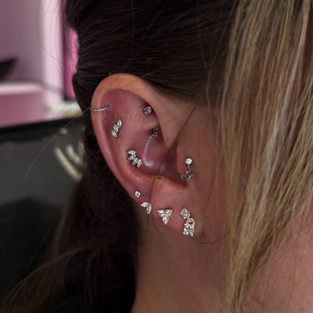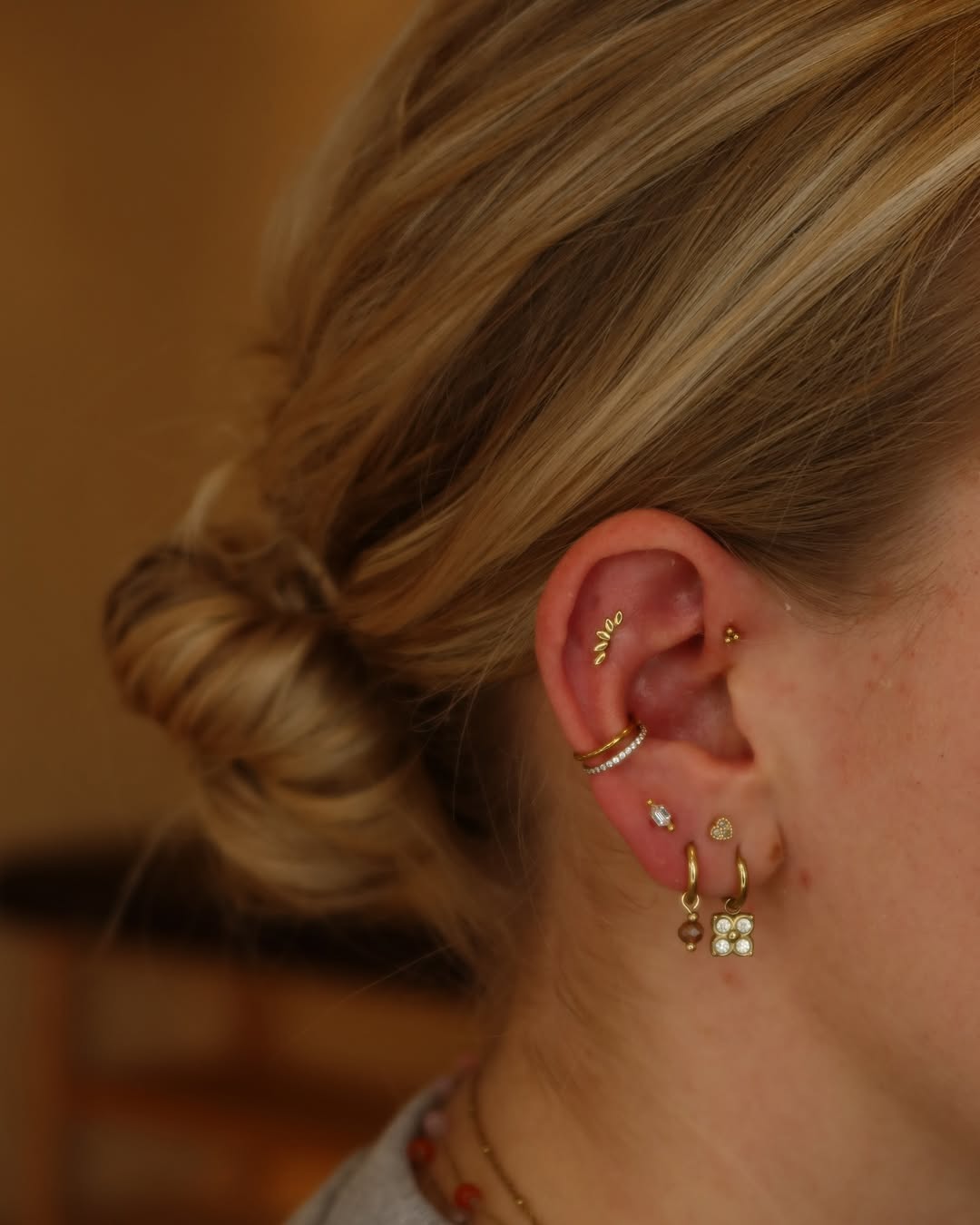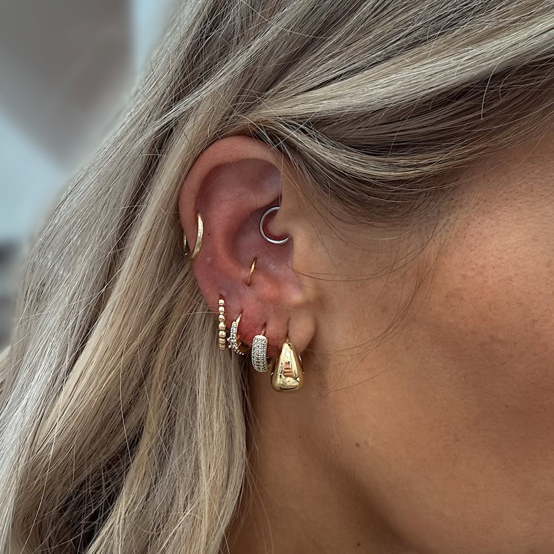 A pearl adorned crescent piece highlights the daith area, becoming the focal point of this extensively curated ear. Multiple tiny hoops and studs populate the cartilage, creating layered dimension.