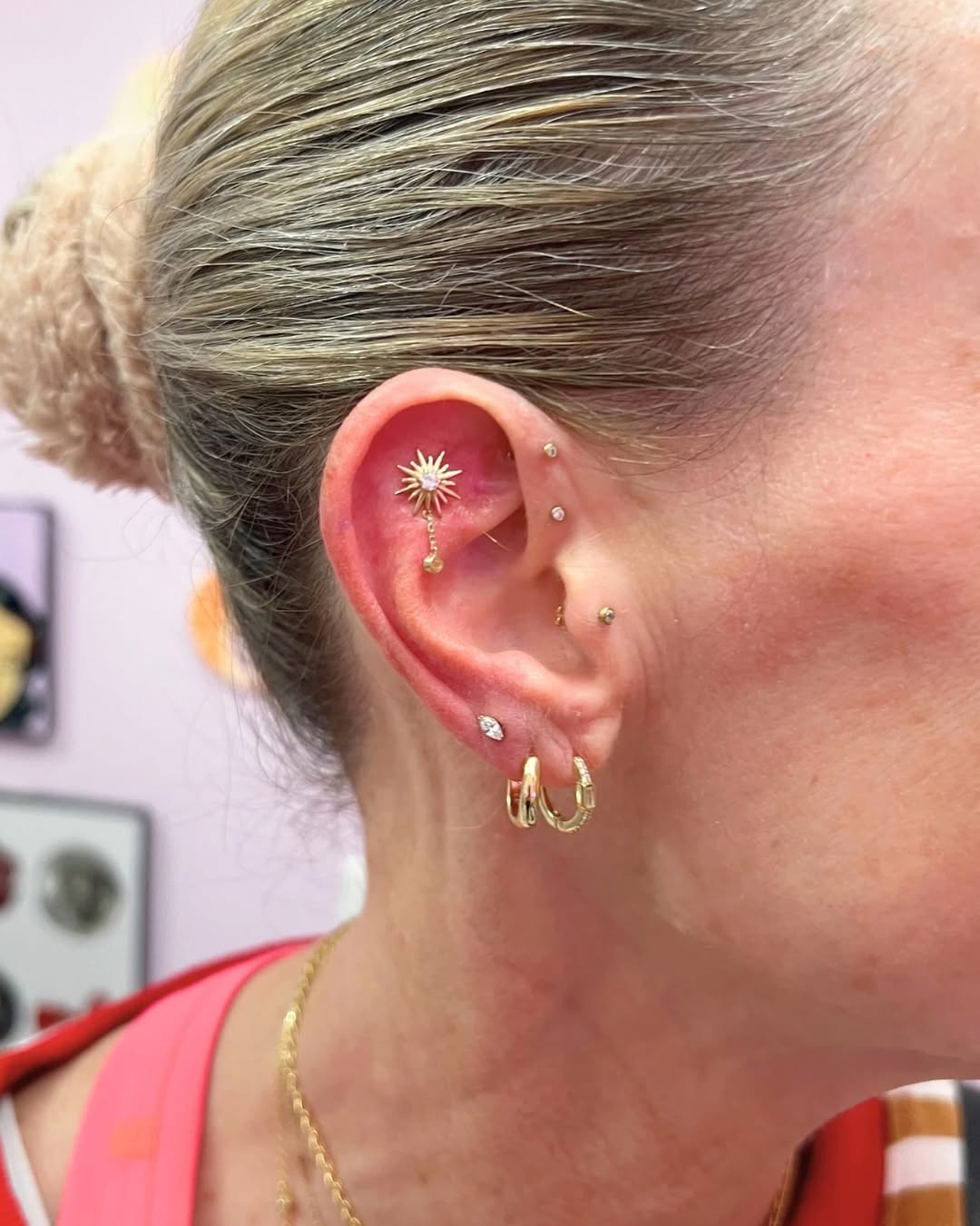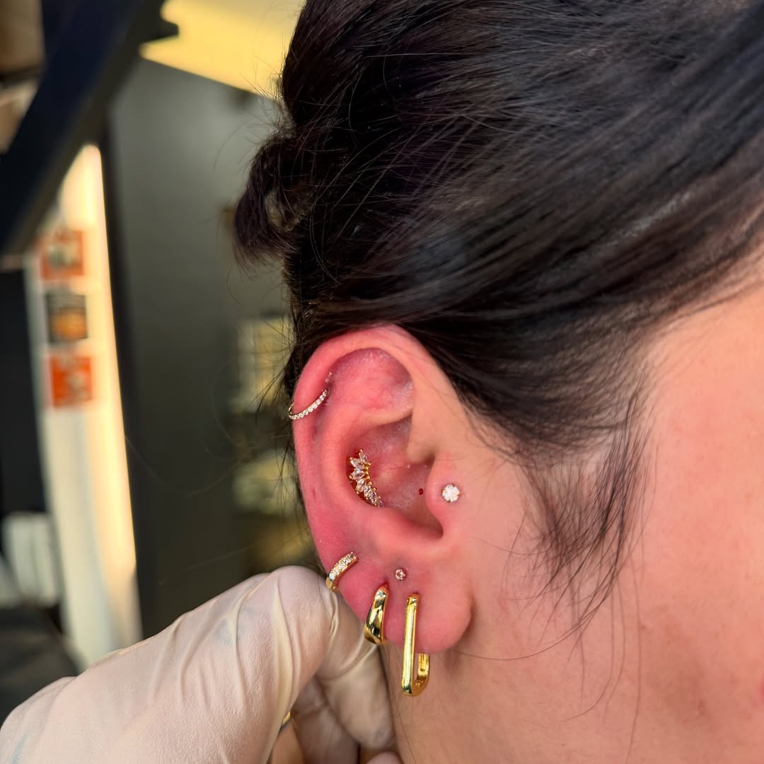 This stunning combination showcases delicate gold jewelry across multiple piercings. A gleaming cartilage cuff pairs beautifully with a crystal-adorned mid-ear piece, creating visual interest.