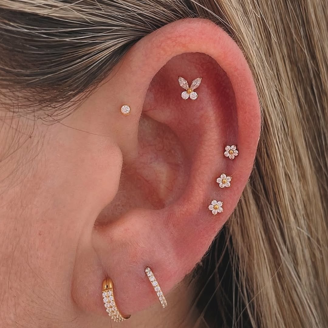 Garden-inspired jewelry creates a whimsical bridal look across this curated ear. A delicate butterfly stud graces the concha, while three tiny daisy flowers bloom along the outer cartilage.