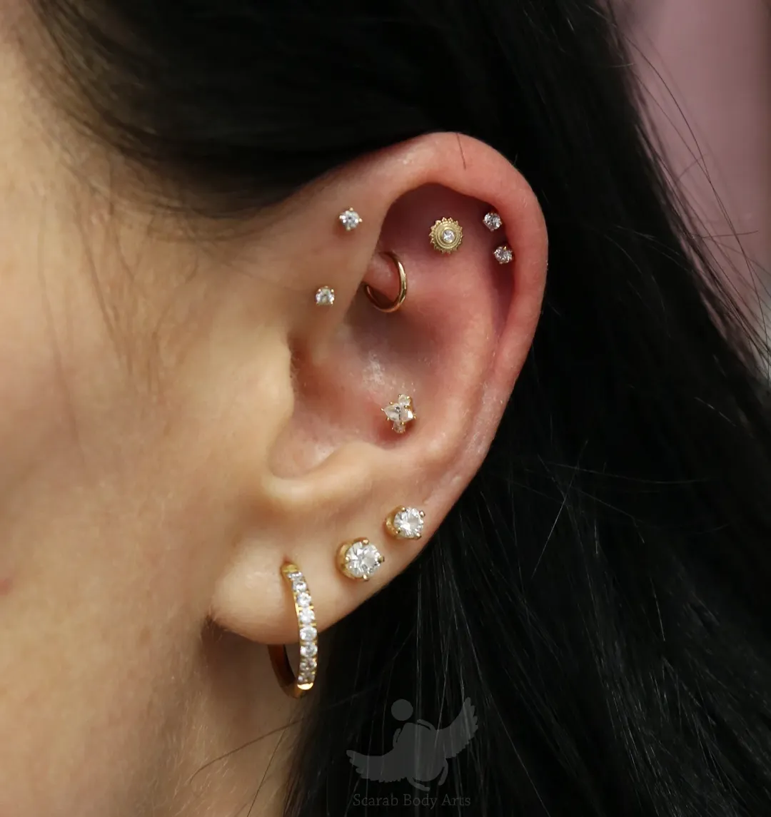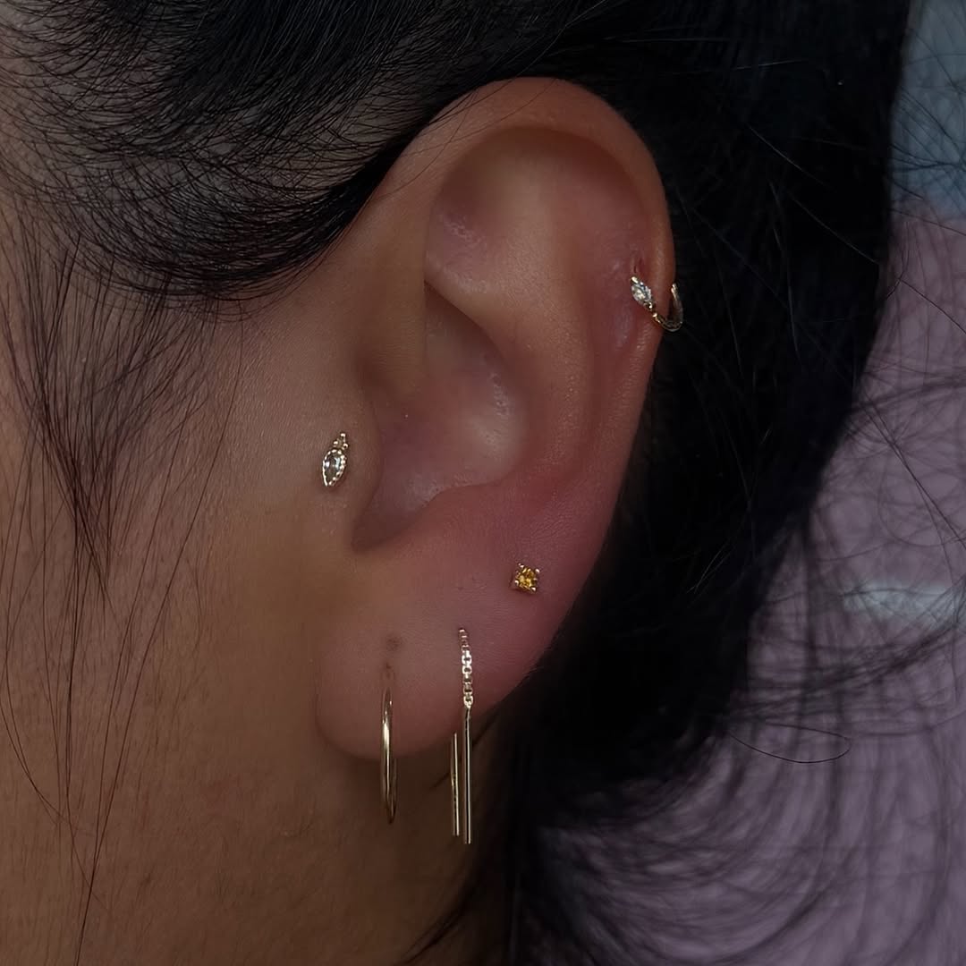 Twin delicate hoops grace the upper helix, creatig a cohesive starting point. A dainty circular piece highlights the daith, while a sleek curved barbell adorns the concha region.