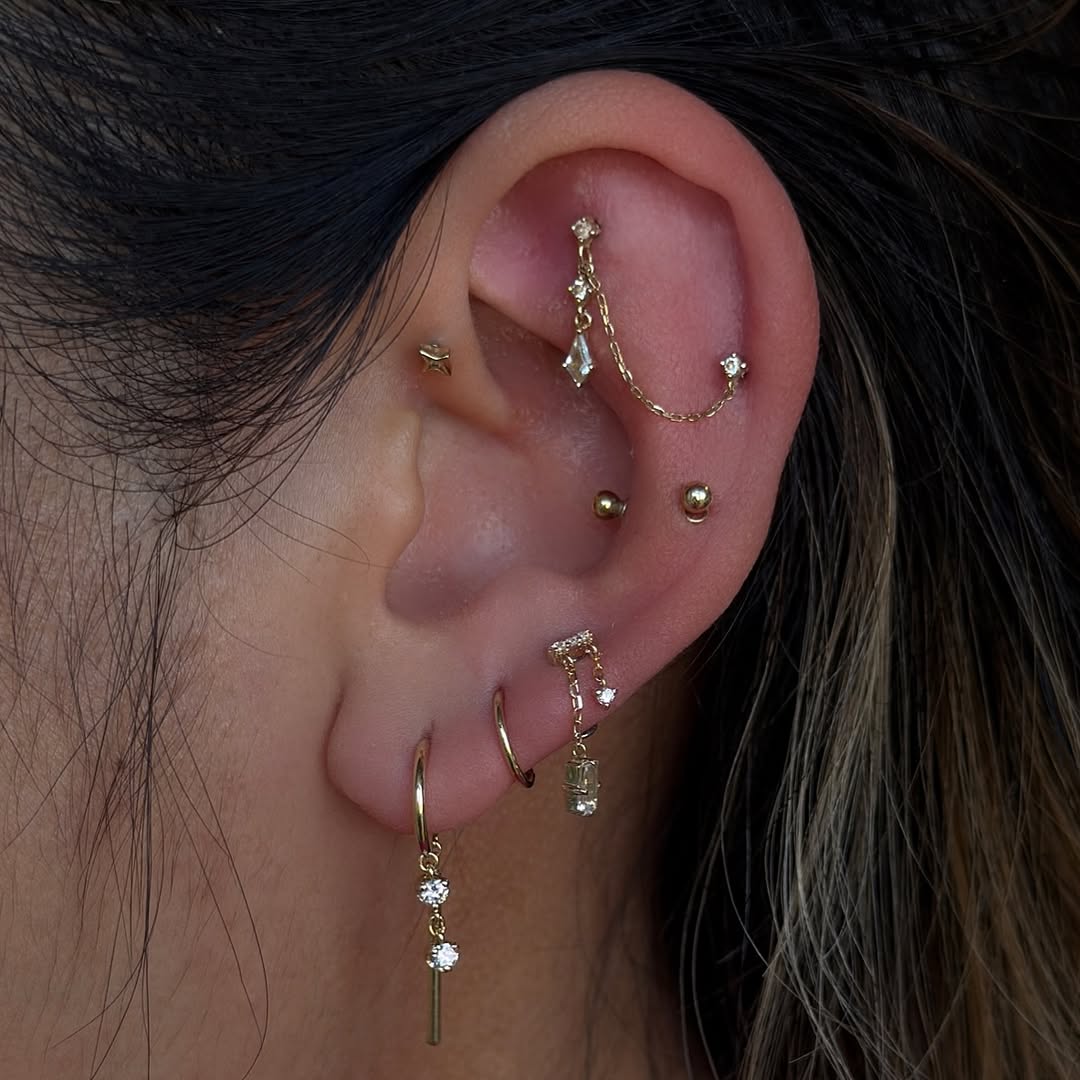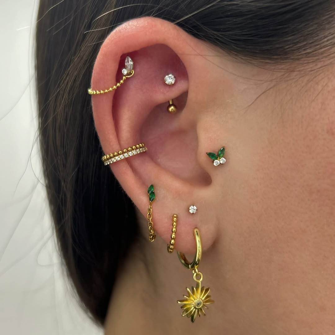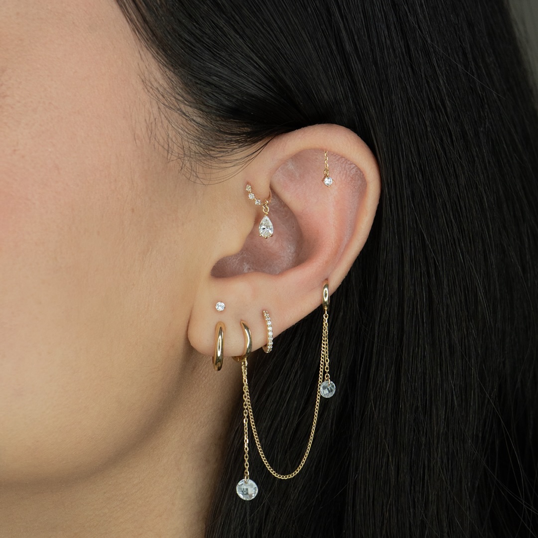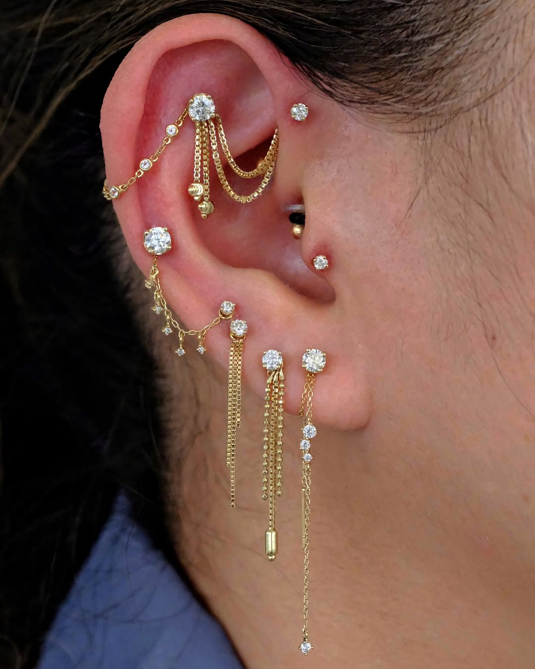 A fine gold chain gracefully links the concha to the upper helix, creating an eye-catching focal point. This innovative connection adds dimension and movement to the ear’s architecture.