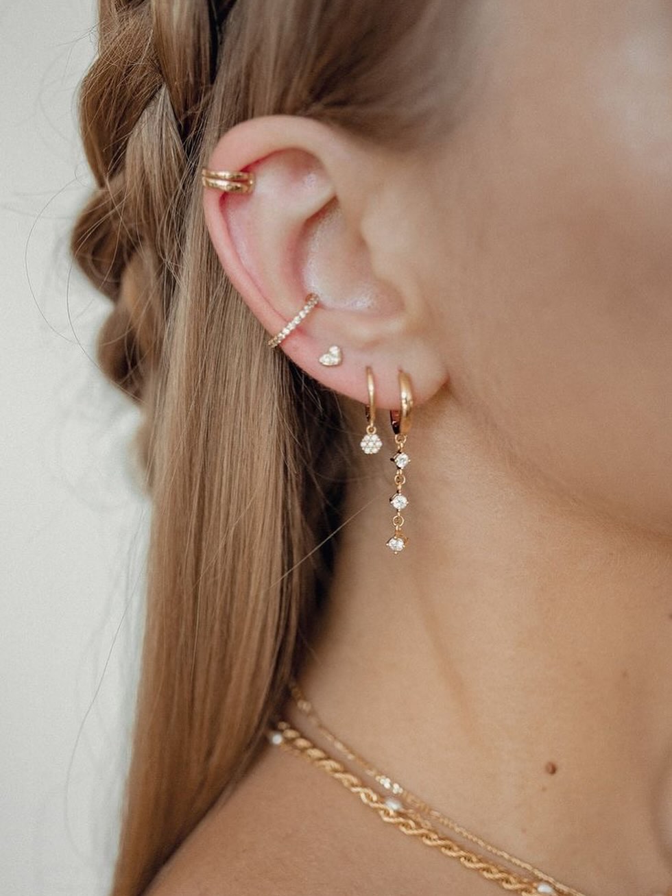 Below, a sweet heart stud sits alongside two lobe hoops. One features an elegant dangling chain with sparkling stones that catch the light with every movement.