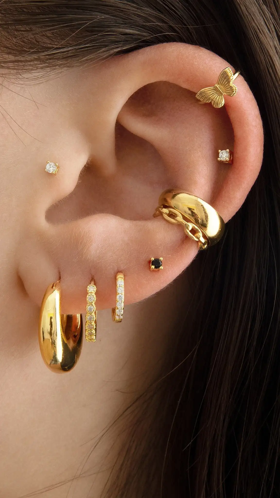 The charming butterfly helix piece adds whimsical personality to an otherwise polished look. Each element complements the others without competing for attention, demonstrating how mixed metals and varied sizes create a cohesive, editorial-worthy aesthetic that elevates everyday accessorizing.
