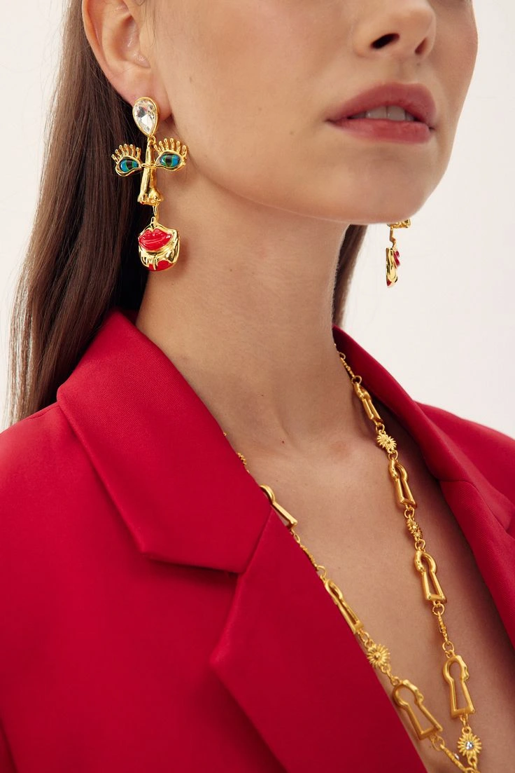 These bold gold earrings transform your lobes into wearable art galleries. Crafted to resemble abstract faces with turquoise eyes and vibrant red lips, they bring surrealist inspiration to everyday styling. The sculptural design captures attention immediately while maintaining wearability through balanced proportions.