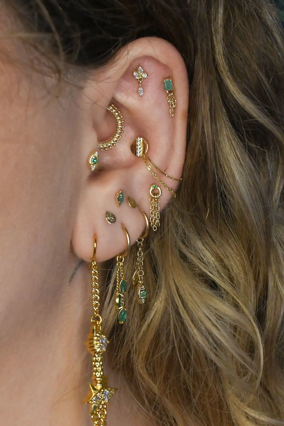 This curated ear styling showcases an opulent collection of gold pieces adorned with emerald accents and sparkling crystals. Multiple piercings create a cascading effect, featuring delicate chains that connect various placements. The mix of studs, hoops, and dangling elements works together to form a cohesive celestial design.