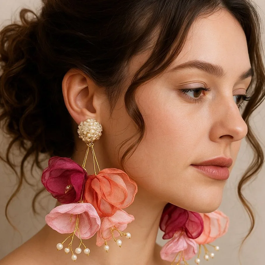 These whimsical statement earrings feature delicate organza petals in blush pink, coral, and burgundy tones cascading from pearl-encrusted studs. Sheer fabric blooms create an ethereal, dimensional effect that sways gracefully with movement. Tiny pearl drops dangle beneath each flower, adding extra charm and sophistication to this artisanal design.