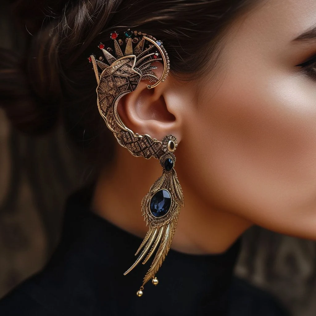 This breathtaking piece transforms your entire ear into a canvas for intricate metalwork. Detailed filigree forms an elaborate peacock design that wraps around the outer ear, complete with ruby accents along the crown. A dramatic sapphire drop with cascading feather elements creates stunning movement below.