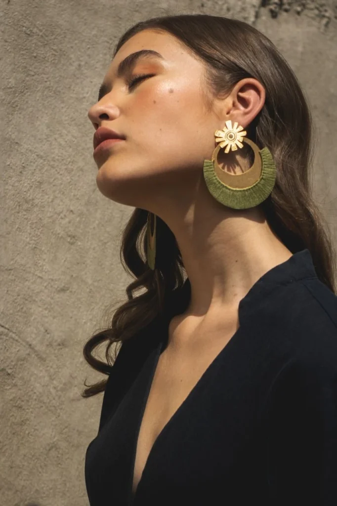 These architectural earrings combine multiple elements for maximum impact. A golden sunburst stud sits at the top, connecting to brushed brass crescents that frame woven olive green raffia fans. The textured combination creates depth through contrasting materials and finishes that catch natural light beautifully.