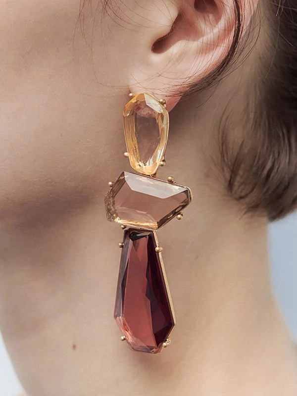 These stunning statement earrings feature three stacked geometric crystals in graduated amber tones. Each faceted stone transitions from light champagne to deep burgundy, creating a mesmerizing ombré effect. The angular cuts catch light beautifully while the substantial size makes an undeniable impact.