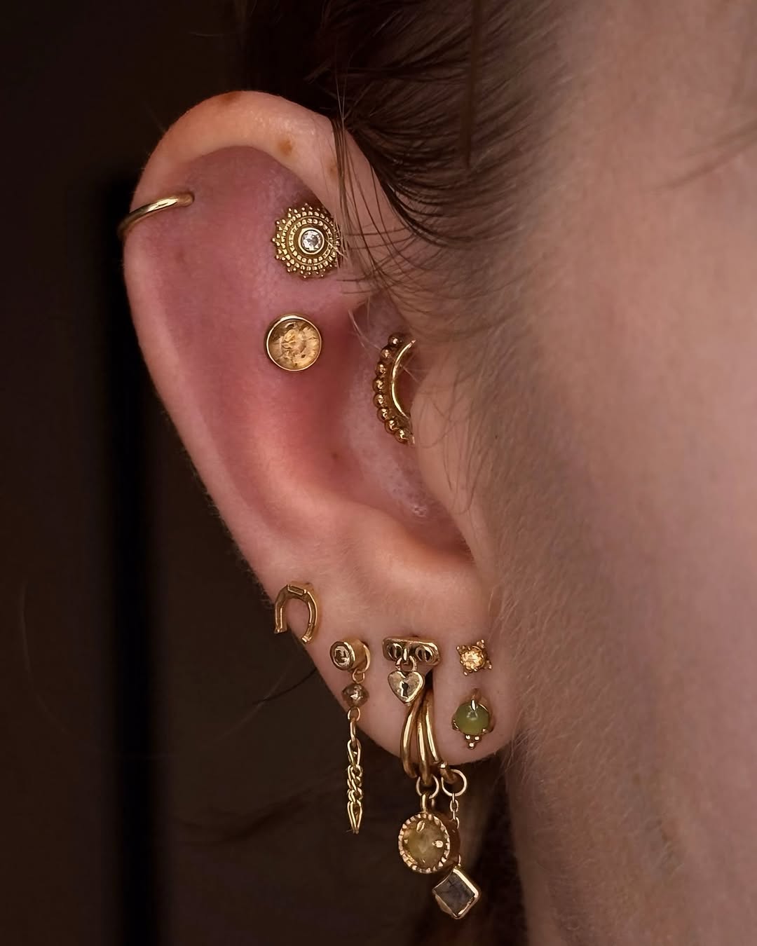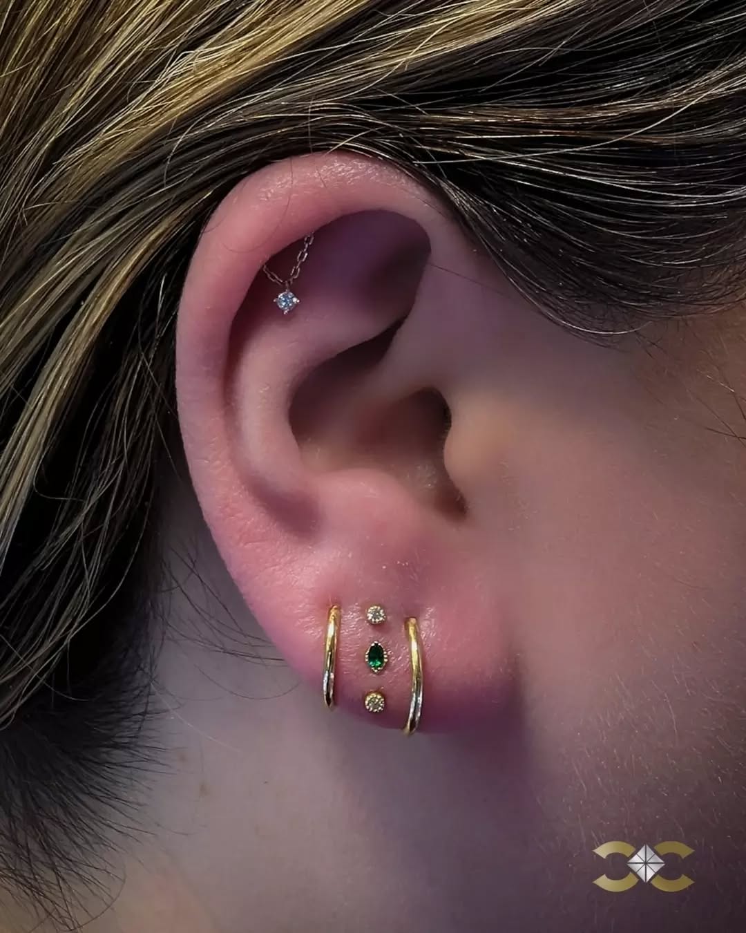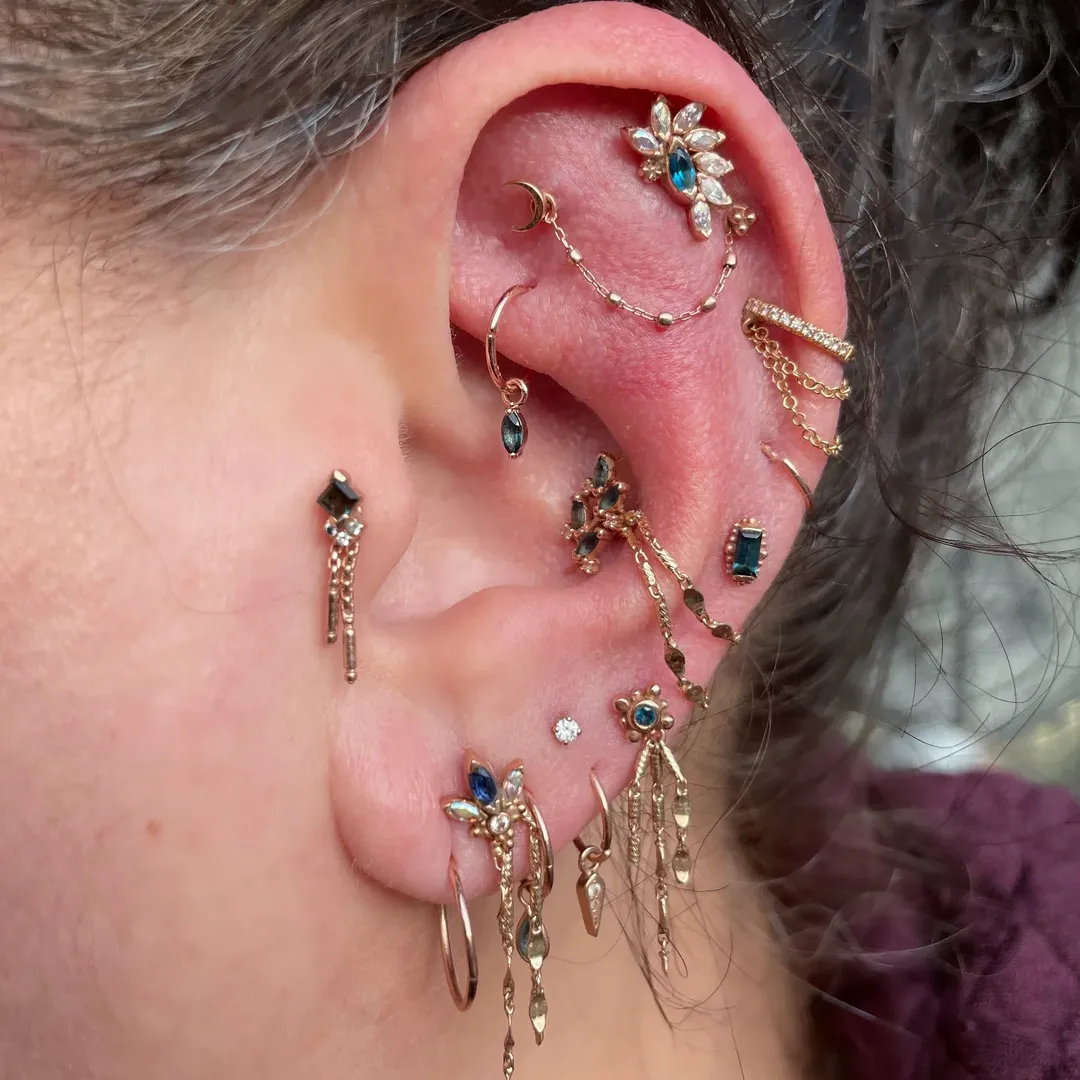Helix and conch piercings take up to 12 months to fully heal. Layered gold chains connecting multiple placements create dramatic movement while keeping the overall aesthetic richly cohesive and eye catching.