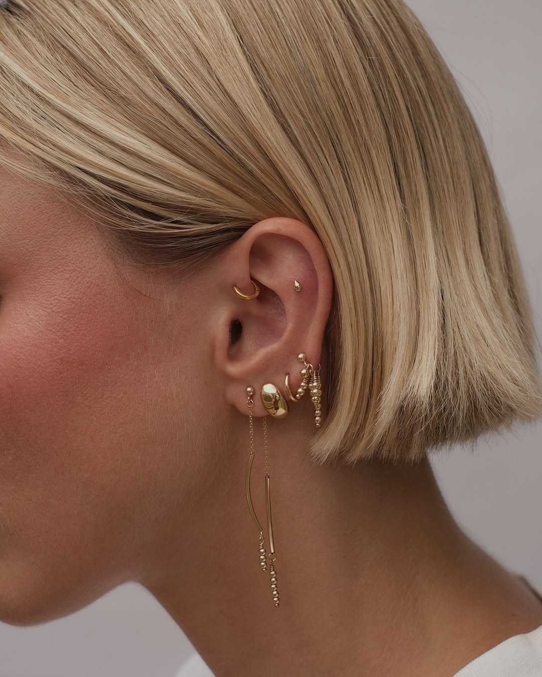 This sleek ear features a small gold crescent rook hoop, teardrop helix stud, chunky gold nugget huggie, beaded ball chain huggie, and a long dangling gold bar and bead threader at the lobe. Lobe placements heal fastest at 6 to 8 weeks.