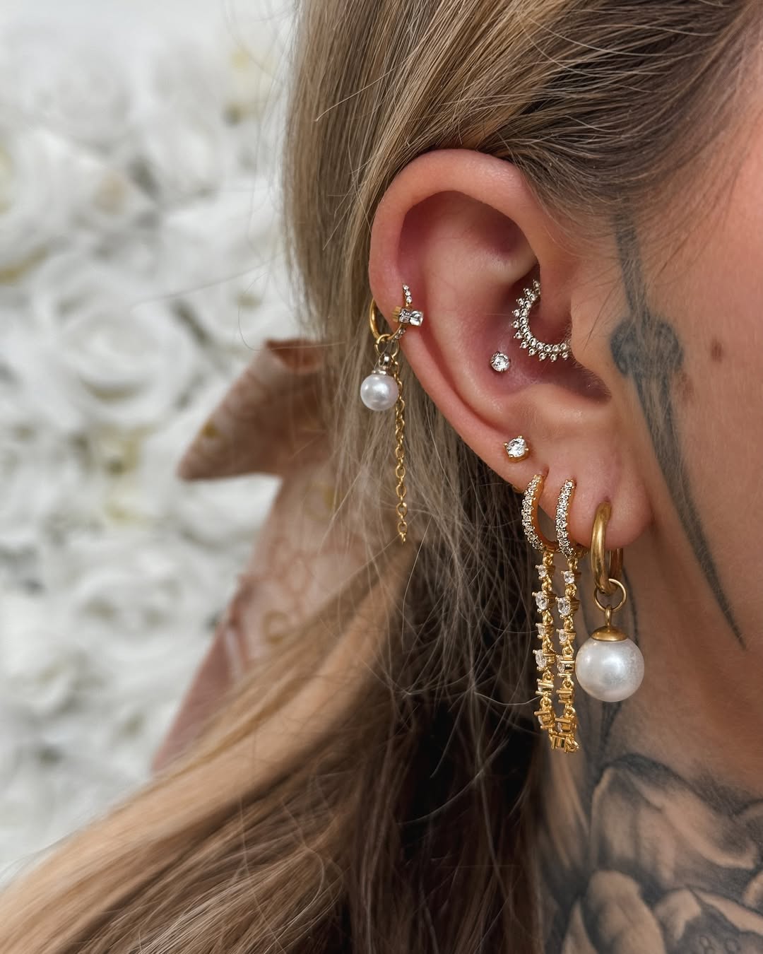 Conch and helix placements take 6 to 12 months to fully heal. Mixing pearl drops with crystal huggies across multiple placements creates a luxurious, bridal inspired stack that looks stunning at every healing stage.