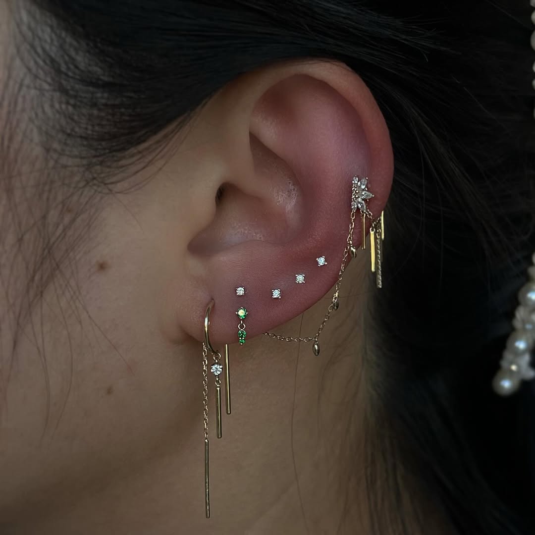 Delicate CZ huggie hoops at the lobe complete this curated stack beautifully. Lobe piercings remain the quickest healing placement overall.