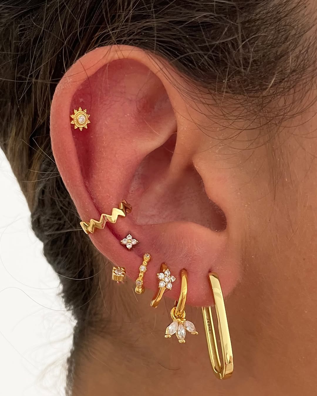 This curated ear features a gold sunburst conch stud, zigzag shaped ear cuff, crystal flower tragus stud, floral charm huggie, and a bold rectangular gold hoop at the lobe. Conch piercings take 6 to 12 months to heal fully.