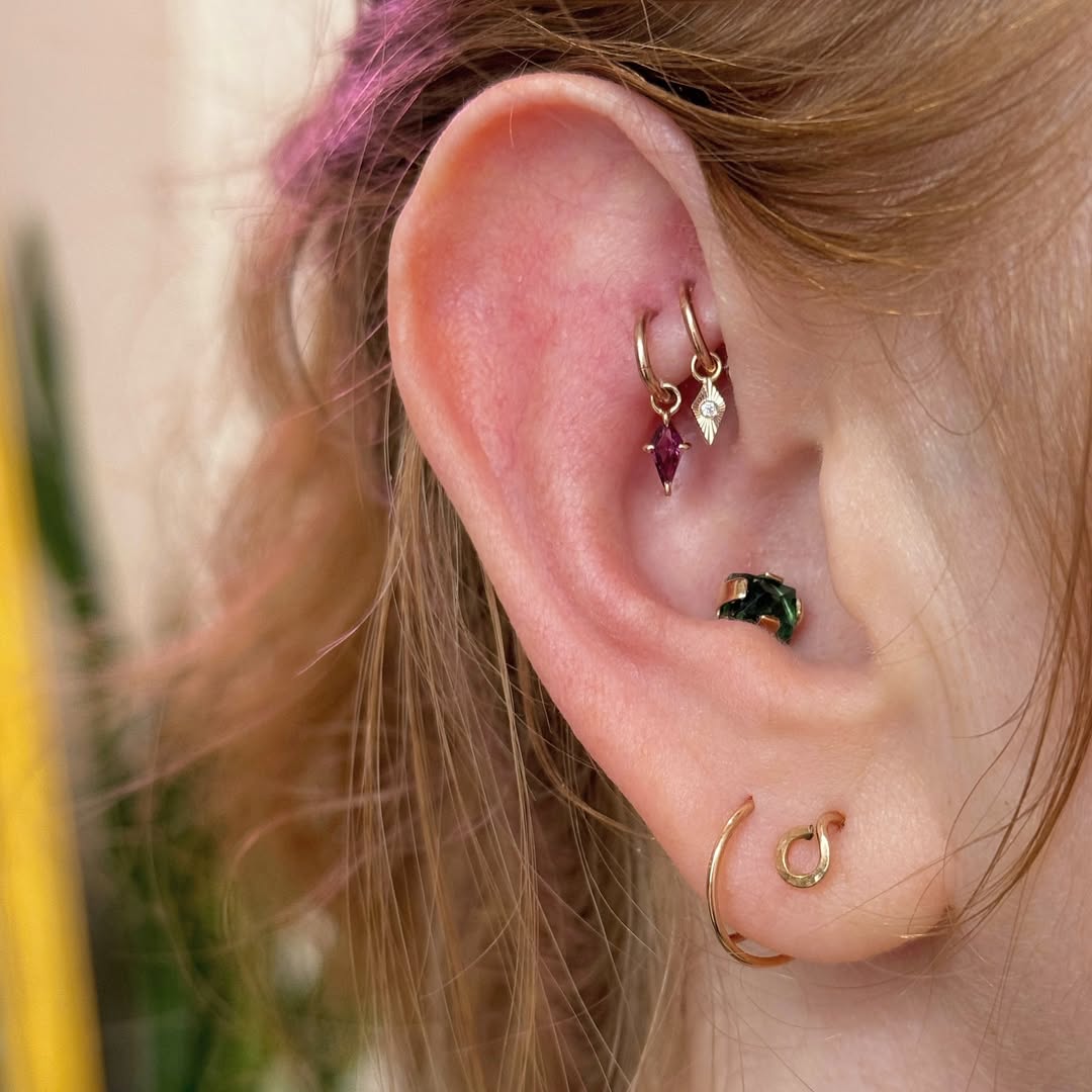 This simple yet striking ear features a gold rook hoop with a dangling etched charm and pink kite gem drop, a bold green tourmaline raw stone tragus stud, and a double gold spiral lobe hoop. Lobe piercings heal fastest at 6 to 8 weeks.