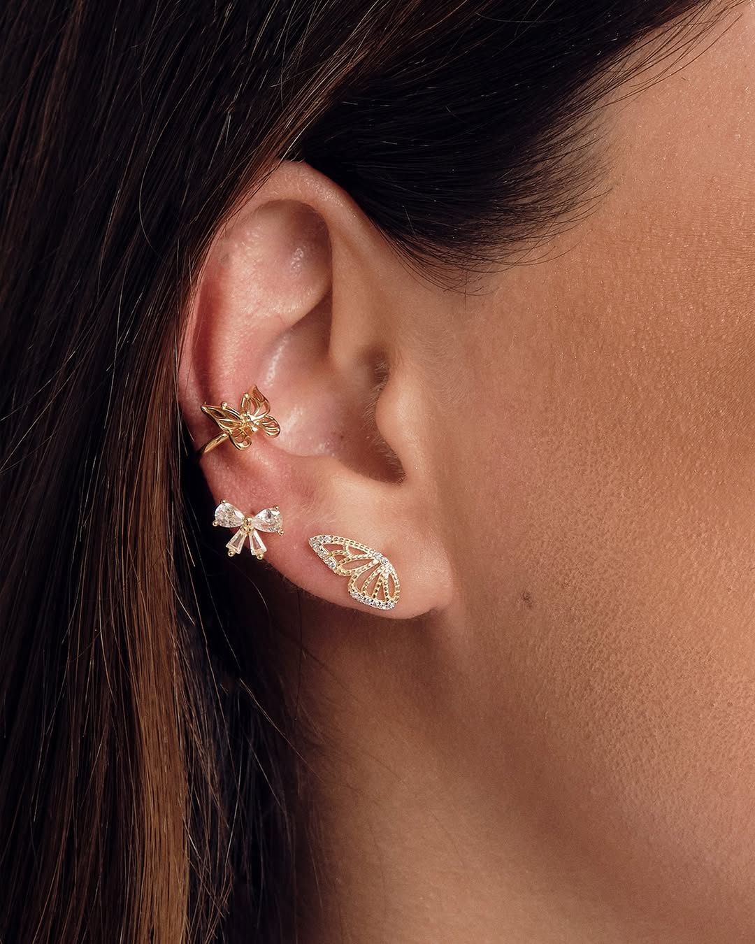 This whimsical ear features a gold dragonfly ear cuff at the helix, a crystal bow stud at the upper lobe, and a large pavé butterfly wing lobe earring. Ear cuffs need zero piercing time and heal instantly.