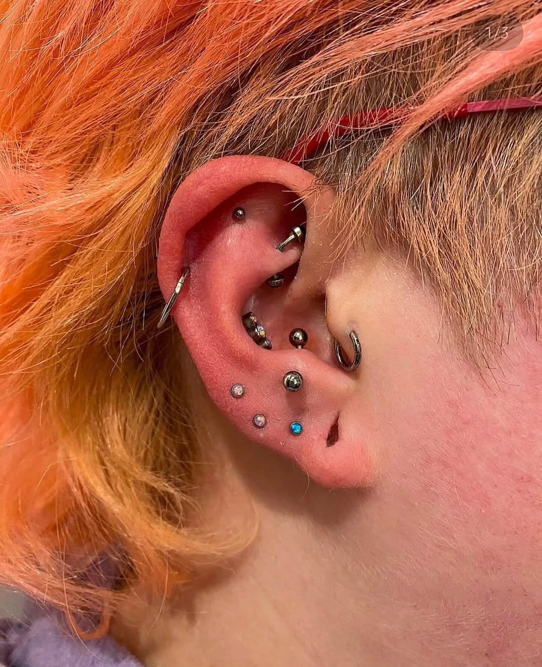 This look features multiple ear piercings across the lobe, helix, and cartilage. Lobe piercings heal fastest, usually within 6 to 8 weeks. Helix and cartilage spots take longer.