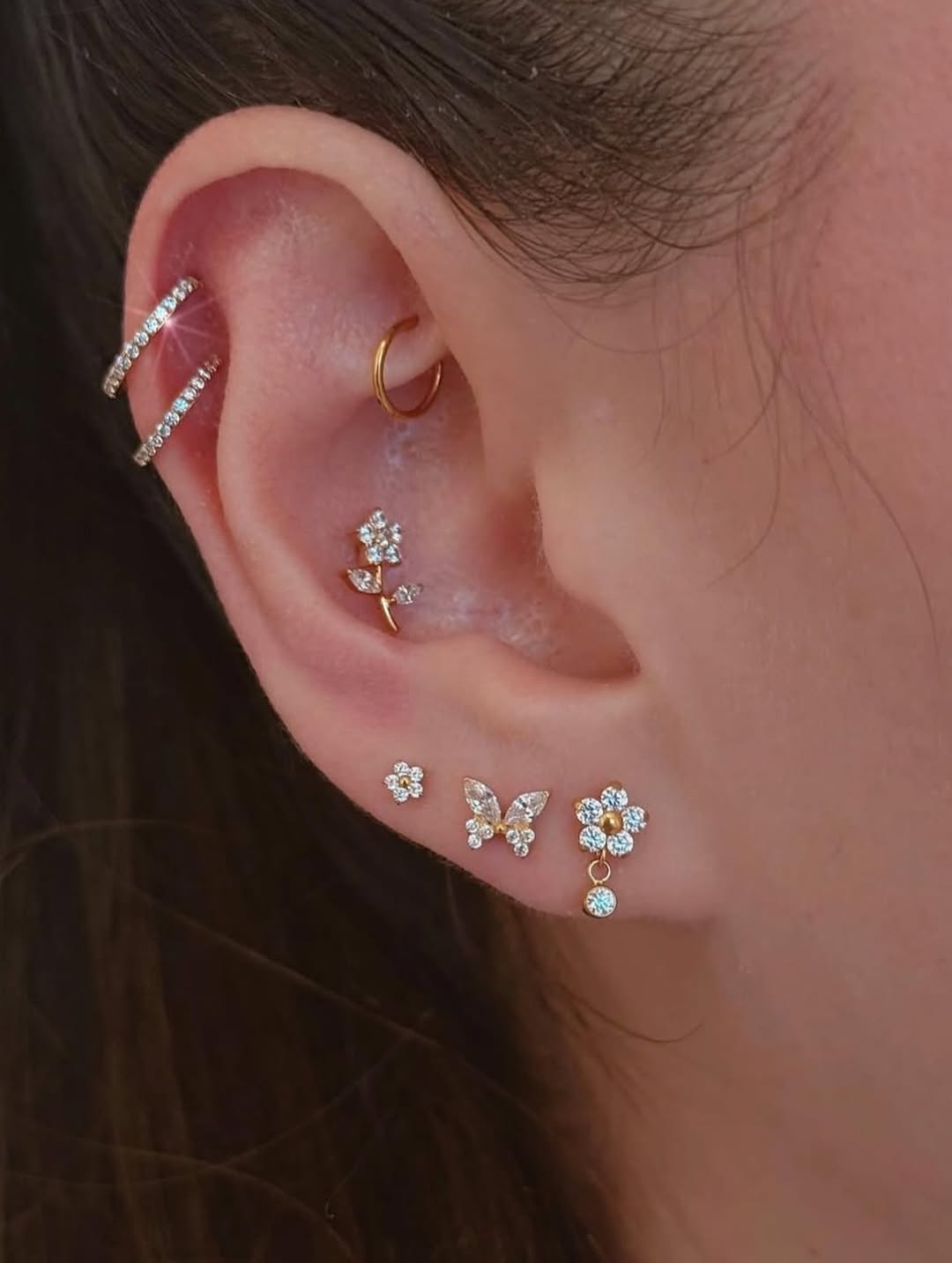 This charming ear features a gold daith hoop, crystal helix cuff, floral tragus stud, and three lobe piercings with flower, butterfly, and daisy drop charms. Triple lobe placements heal fastest at 6 to 8 weeks.