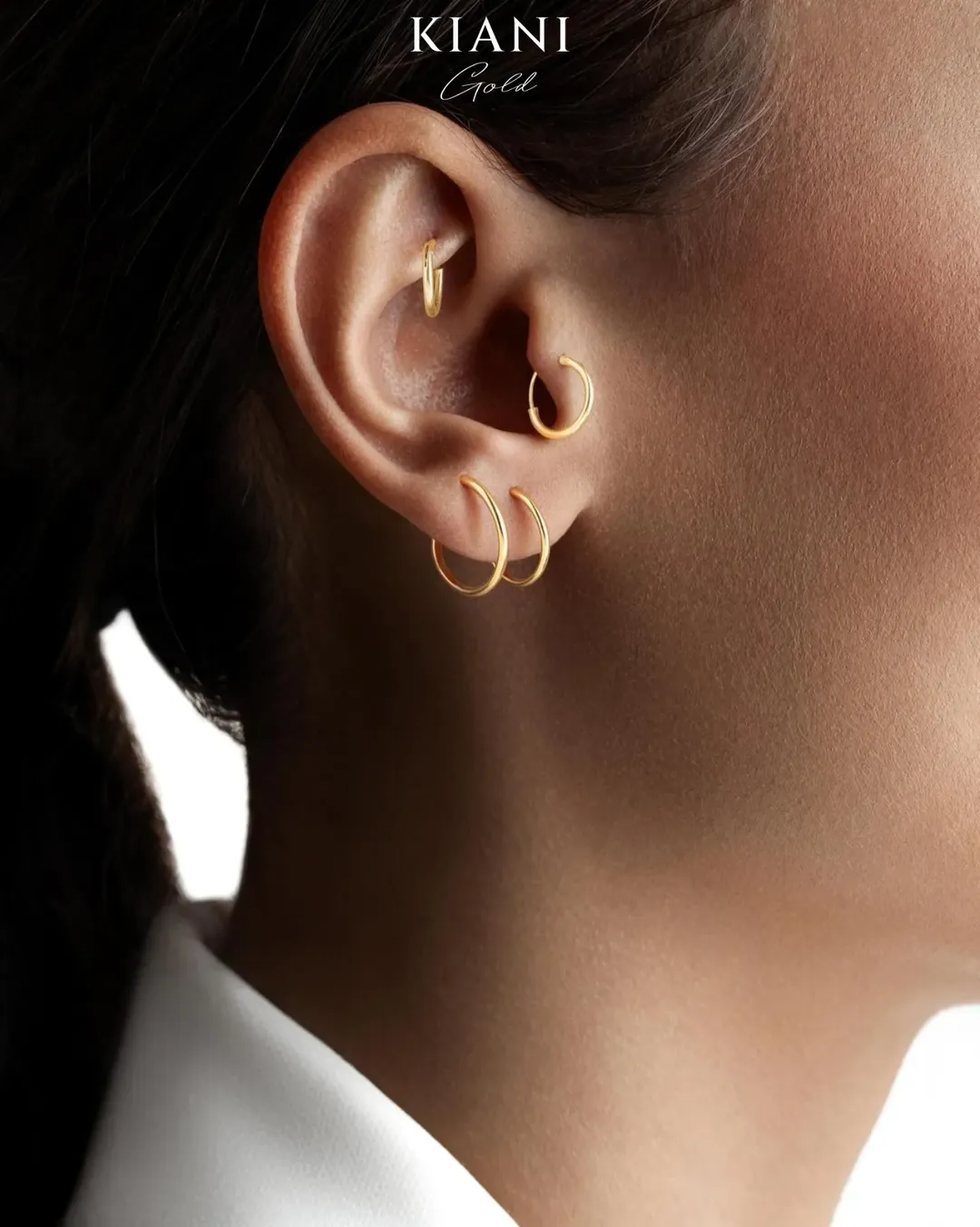 Clean gold huggies keep this look timeless and understated. Smooth seamless hoops reduce snagging, which actively promotes faster healing across every placement in this curated stack.