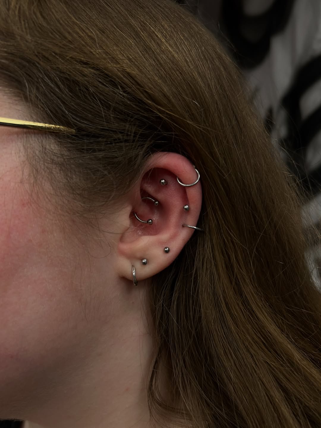 This ear features a full silver stack including helix rings, rook, conch, and lobe piercings. Lobe placements heal fastest at 6 to 8 weeks. Rook and conch piercings need 6 to 12 months to fully heal.