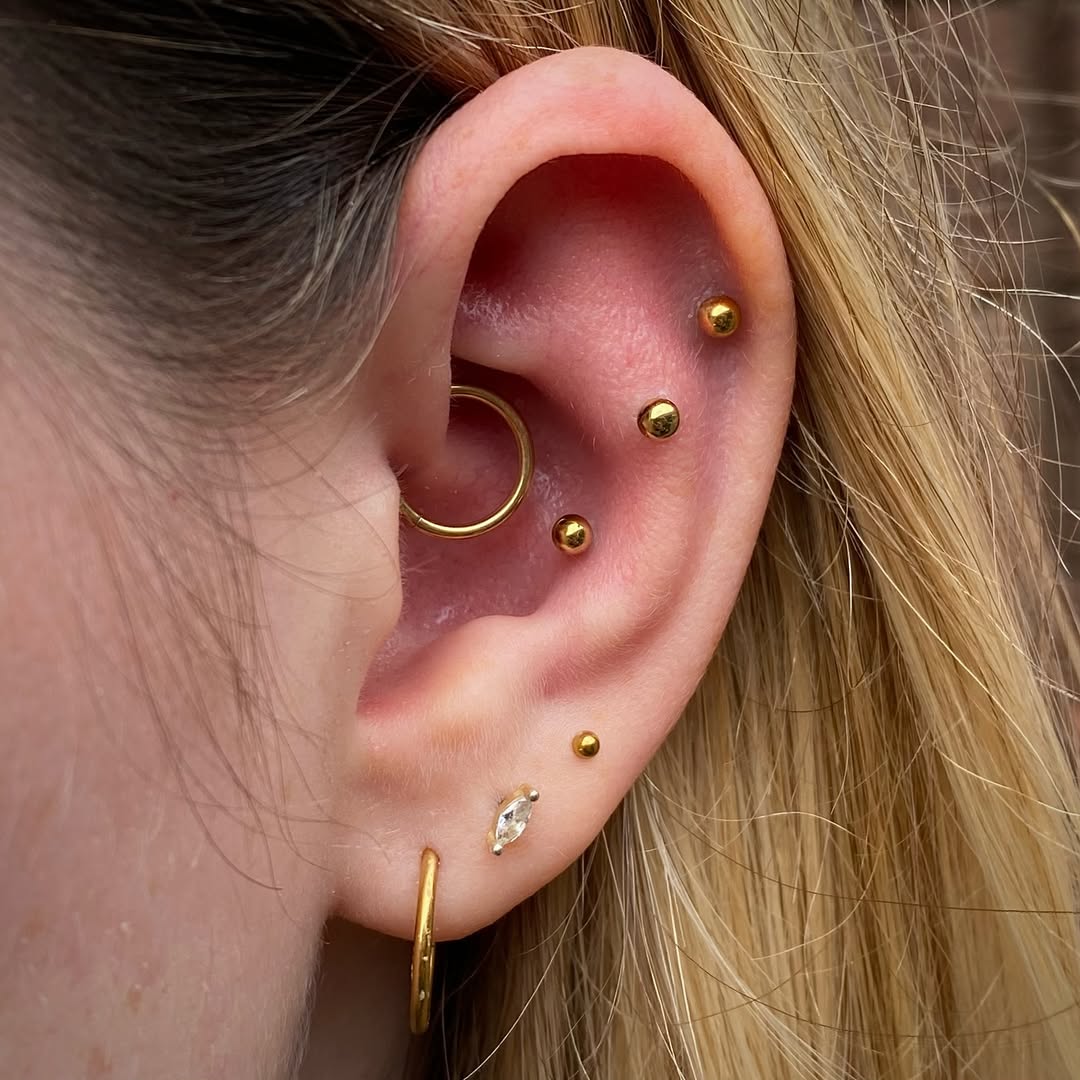 This clean ear features three gold ball studs across the tragus and inner conch, a simple gold daith hoop, a marquise crystal lobe stud, and a gold huggie hoop below. Lobe placements heal fastest at 6 to 8 weeks.