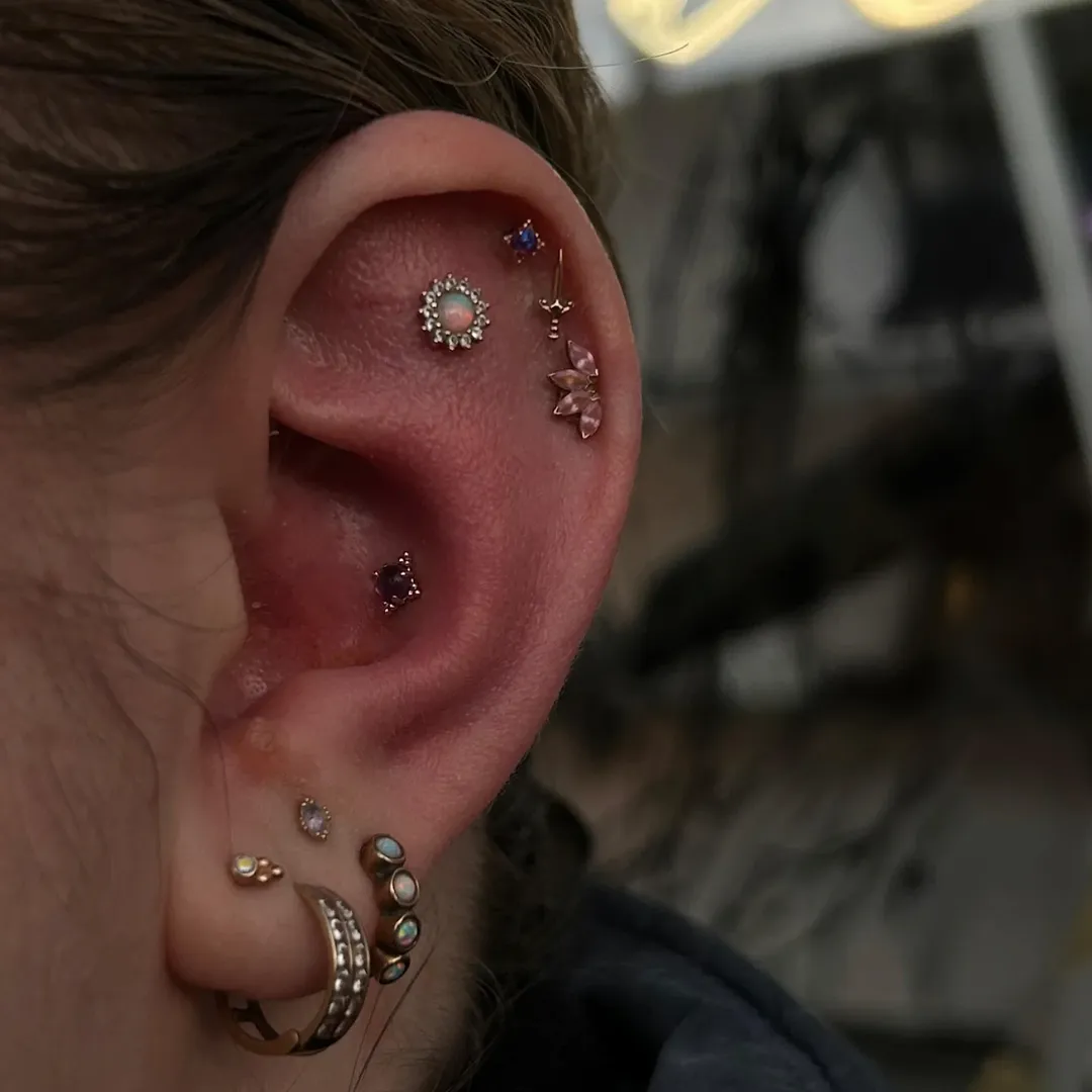 Cartilage piercings like the conch and helix take 6 to 12 months to heal fully. Opal and gemstone flat back studs sit flush against tissue, reducing irritation and genuinely supporting faster healing across every cartilage placement.