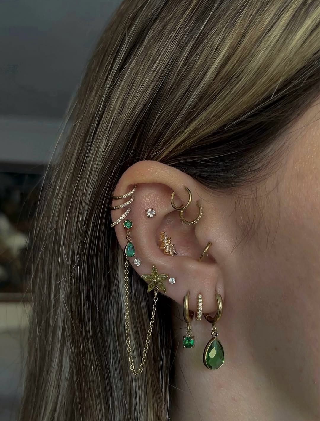 This bold ear features emerald green gem drop hoops, gold chain ear cuffs, star studs, helix rings, and crystal conch jewelry. Lobe placements with the green teardrop huggies heal fastest at 6 to 8 weeks.