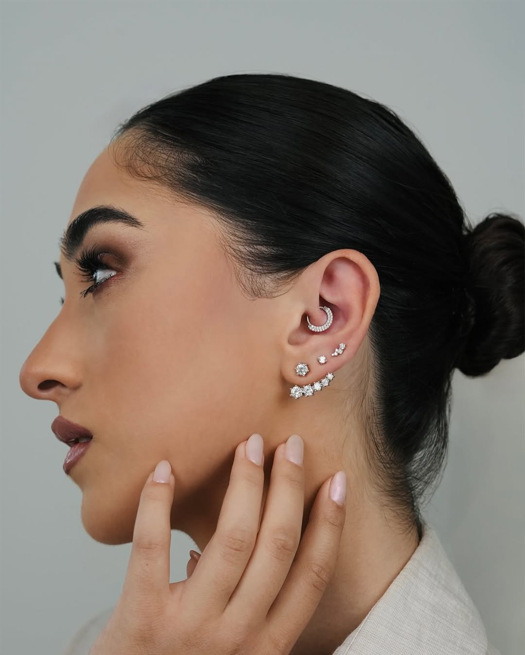 This elegant ear stack showcases a crystal paved daith hoop, small tragus studs, and a stunning CZ ear crawler at the lobe. Lobe piercings heal fastest within 6 to 8 weeks. Daith placements need 6 to 12 months.