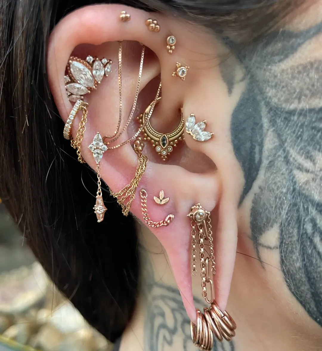This breathtaking rose gold ear features a ornate mandala daith hoop, marquise crystal conch cluster, multiple box chain drops, leaf tragus stud, curb chain lobe piercing, and five stacked rose gold lobe hoops. Lobe placements heal fastest at 6 to 8 weeks.