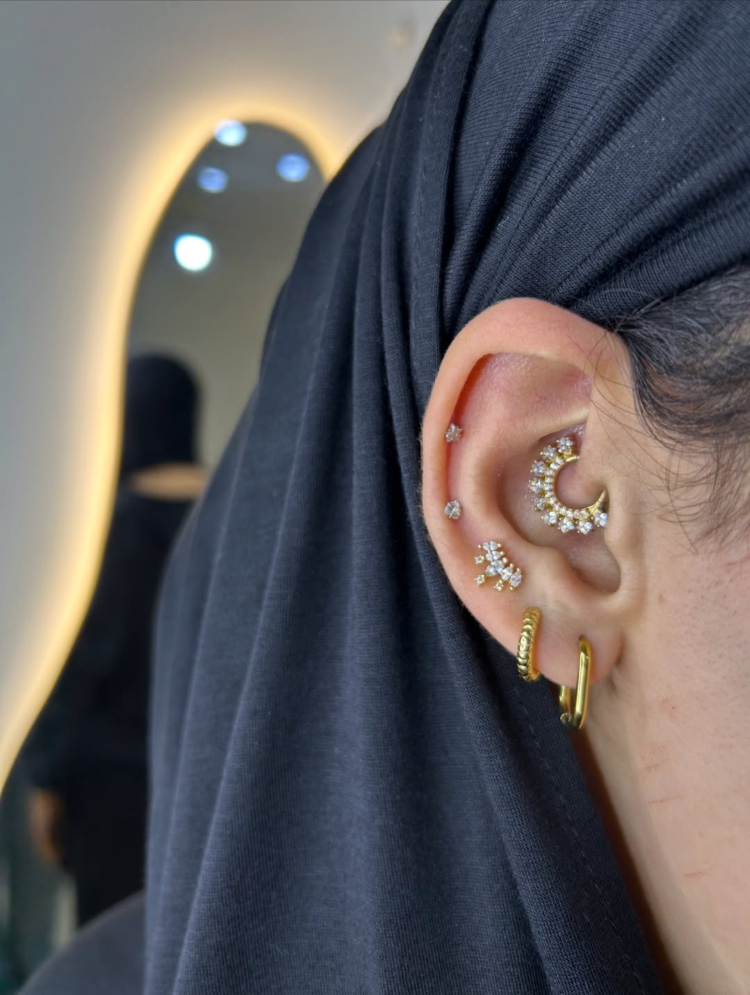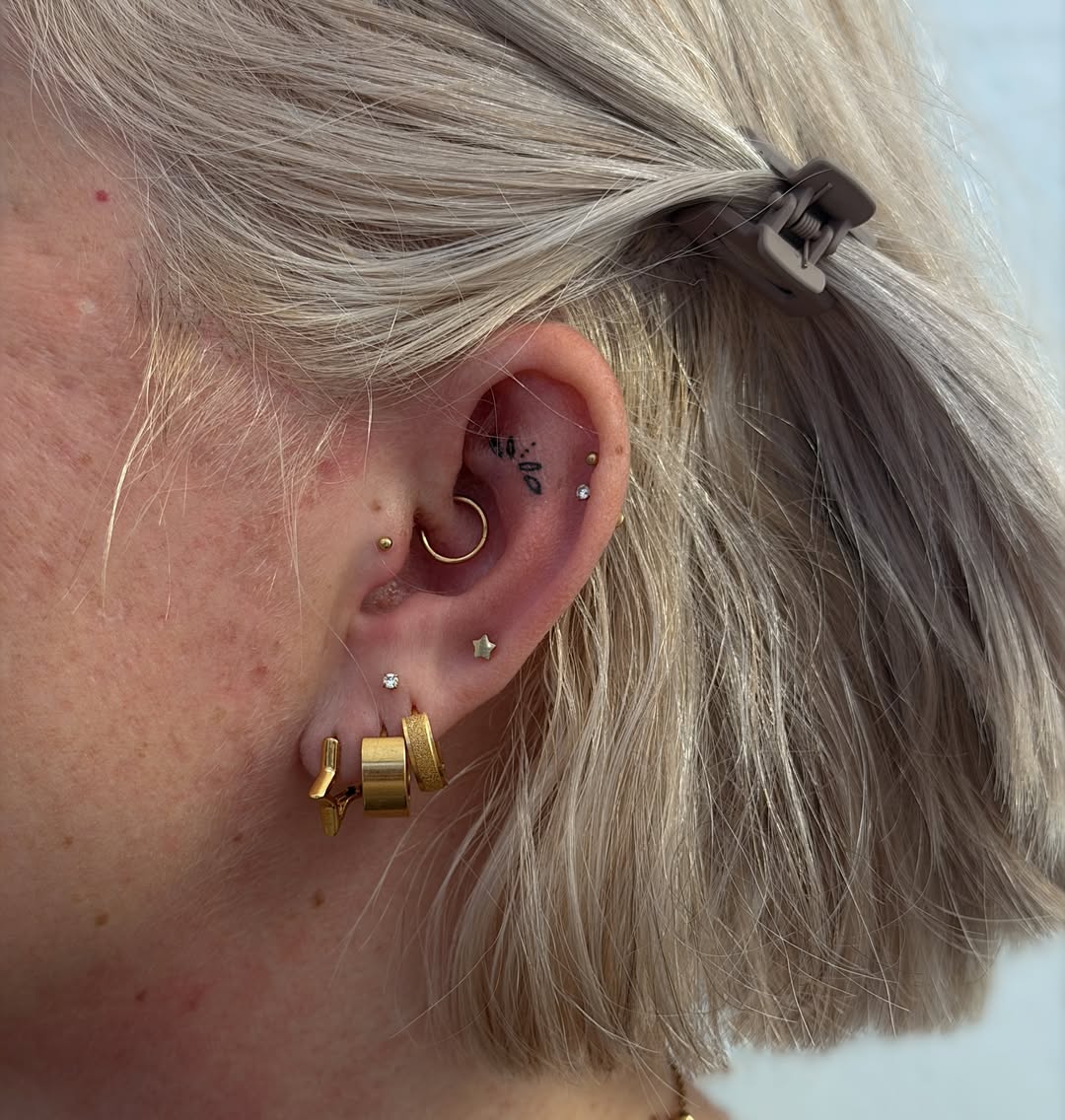Daith placements typically take 6 to 12 months to fully heal. Gold textured huggies at the lobe add bold dimension while remaining gentle enough to support faster, healthier healing overall.