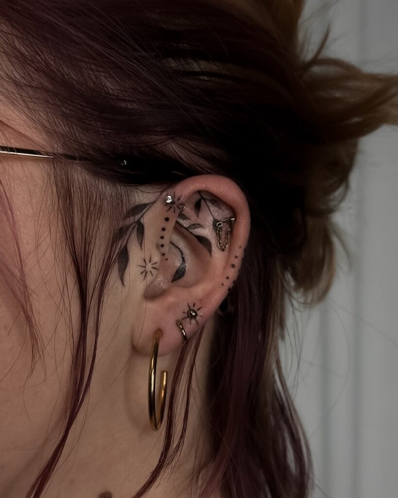 This striking ear combines delicate botanical ink tattoos covering the helix, conch, and tragus areas with a crystal helix stud, small chain piercing, star tragus stud, and bold gold hoop at the lobe.