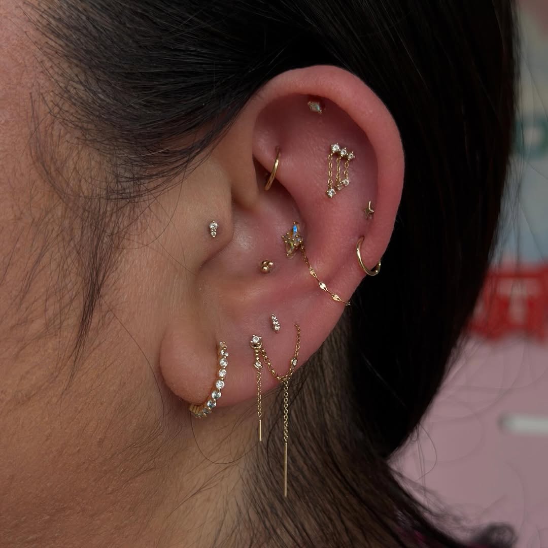 Inner conch placements take 6 to 12 months of dedicated care to fully heal. Long gold chain threaders at the lobe create stunning movement and length while keeping all pressure away from the slower healing cartilage piercings above.