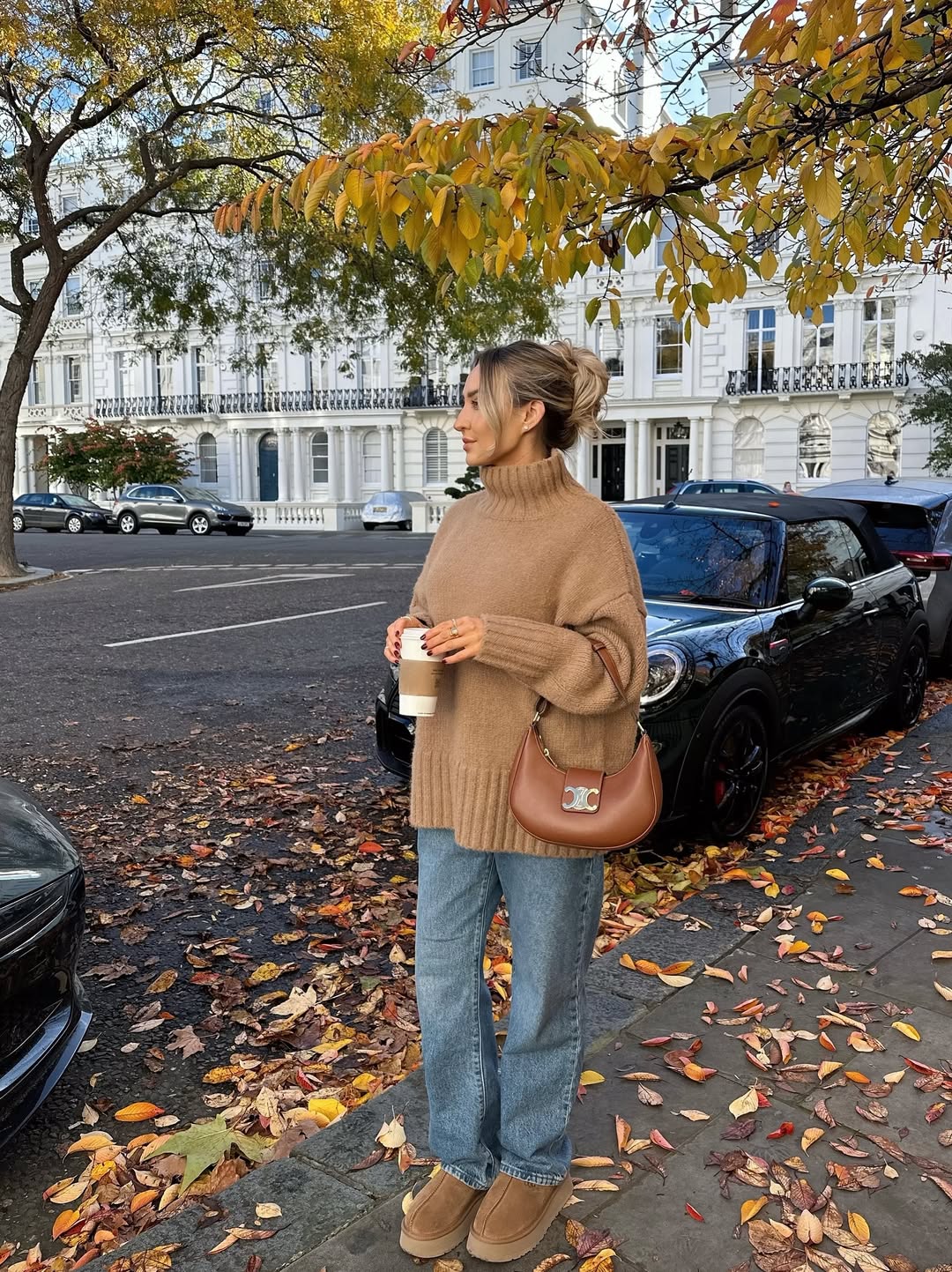 Autumnal warmth radiates from this oversized camel turtleneck sweater paired with light wash straight leg jeans. Tan slip on boots create a tonal monochrome look that feels cozy and cohesive. A brown leather shoulder bag completes the earthy color palette beautifully.