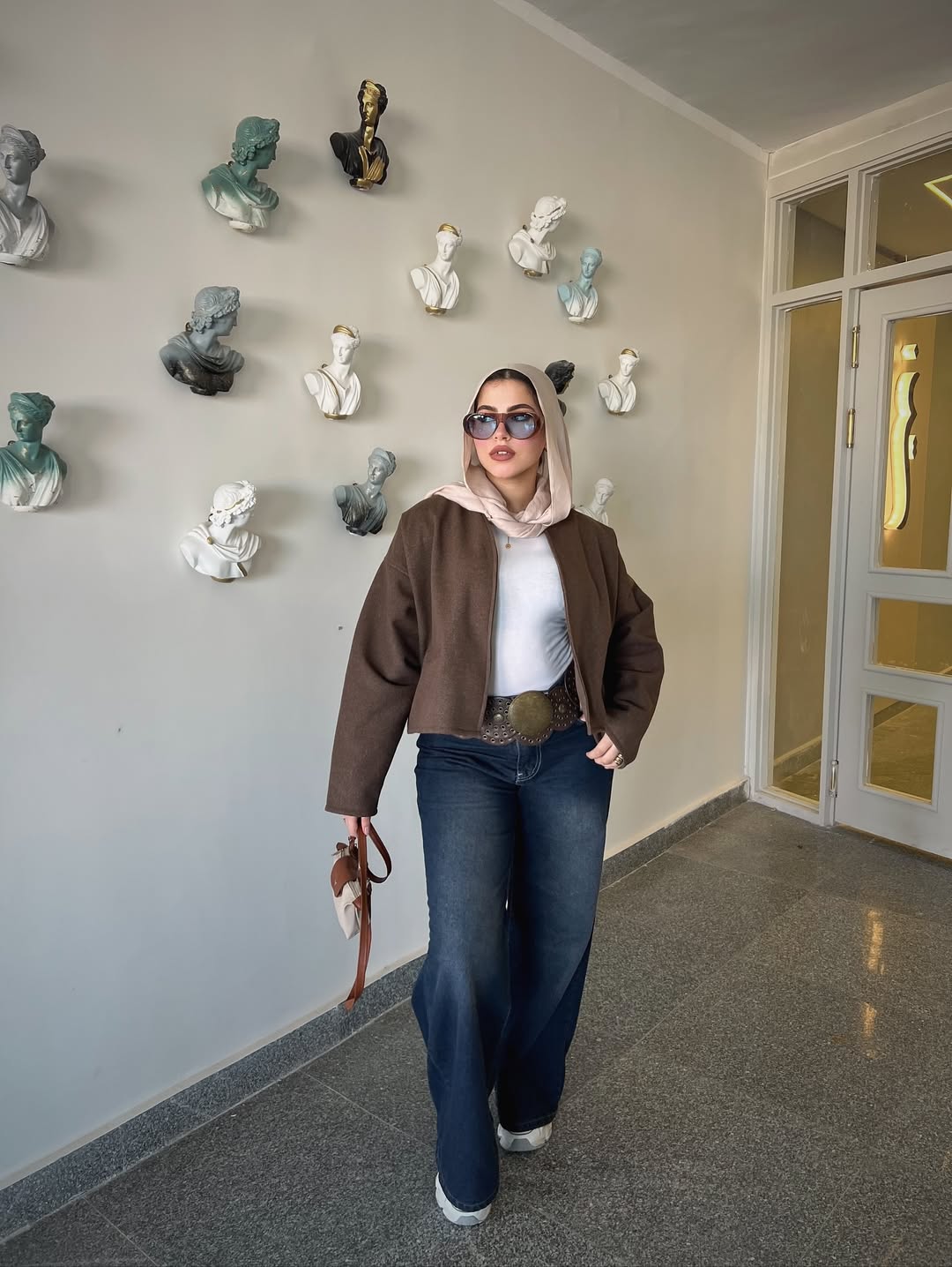 Contemporary comfort defines this relaxed winter ensemble built around a cropped brown jacket. Underneath, a simple white top provides clean contrast while dark blue wide leg jeans create a flattering silhouette. A beige patterned scarf wraps loosely around the head, adding modest elegance. A statement brown belt with decorative buckle cinches the waist stylishly. Oversized blue tinted sunglasses and a two tone handbag finish this museum ready look that balances casual ease with artistic flair.