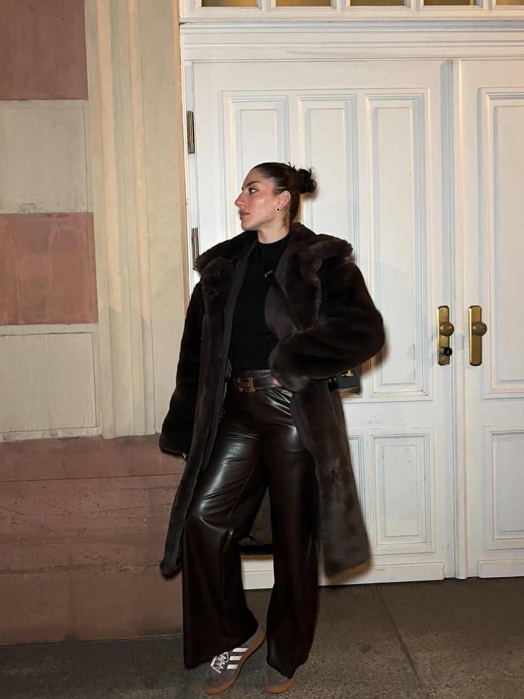 Dramatic monochrome styling defines this luxurious winter ensemble centered around a plush brown faux fur coat. Underneath, glossy black leather pants create sleek contrast against a matching black sweater. A brown leather belt with gold hardware adds waist definition while grey sneakers provide unexpected casual comfort. This head to toe dark palette exudes confidence and urban sophistication. The mix of textures from fur to leather to knit creates dimensional interest throughout the outfit.