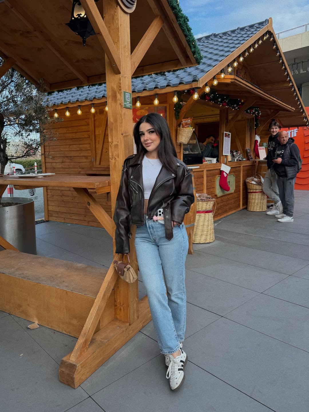 Timeless cool emerges when you style classic leather jackets with relaxed denim for festive outdoor events. The combination stays warm enough for chilly evenings at Christmas markets. White sneakers provide all day comfort for exploring holiday stalls.
