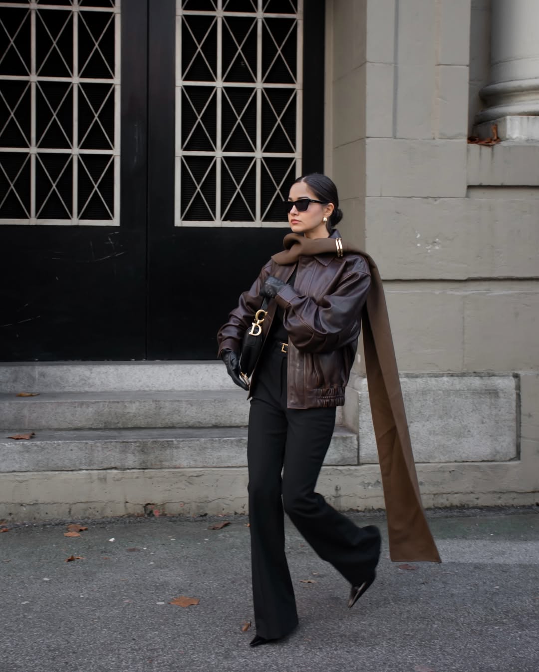 Commanding attention comes naturally with this chocolate brown leather jacket draped over black flared trousers. A matching brown scarf adds cozy layering while gold statement bangles provide luxe accents. Black sunglasses and a designer bag complete this effortlessly cool city look.
