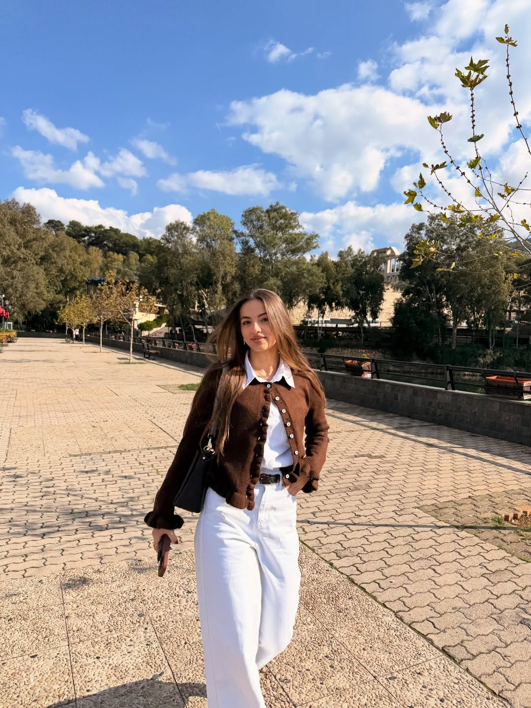 Crisp contrast emerges from this brown knit cardigan layered over a classic white collared shirt. White wide leg pants create a clean bright base that feels fresh and modern. A black shoulder bag and belt add grounding accents to the light color palette.